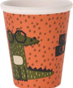 Becher aus orangefarbenem Melamin mit Tiermotiv eines Krokodils.