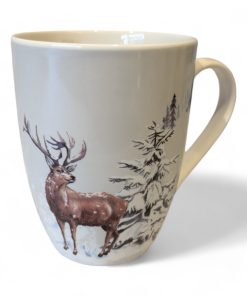 Tasse in weißem Porzellan mit Kronhirsch im winterweißen Wald. 35 cl.