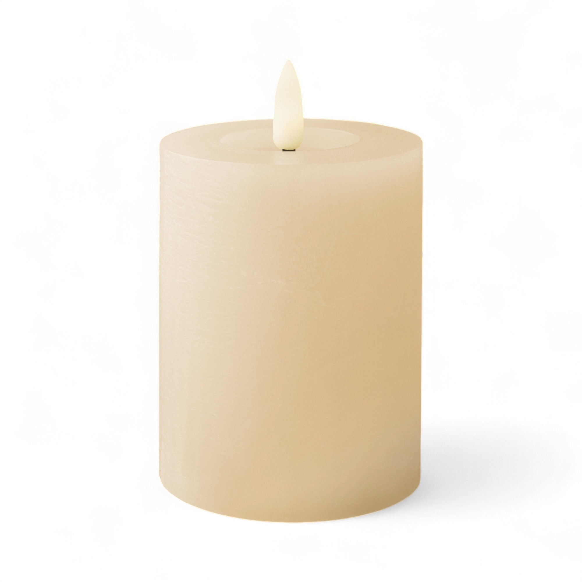 LED Blockkerze in cremefarben mit flacher Spitze, Durchmesser 7 cm, Höhe 11,2 cm.