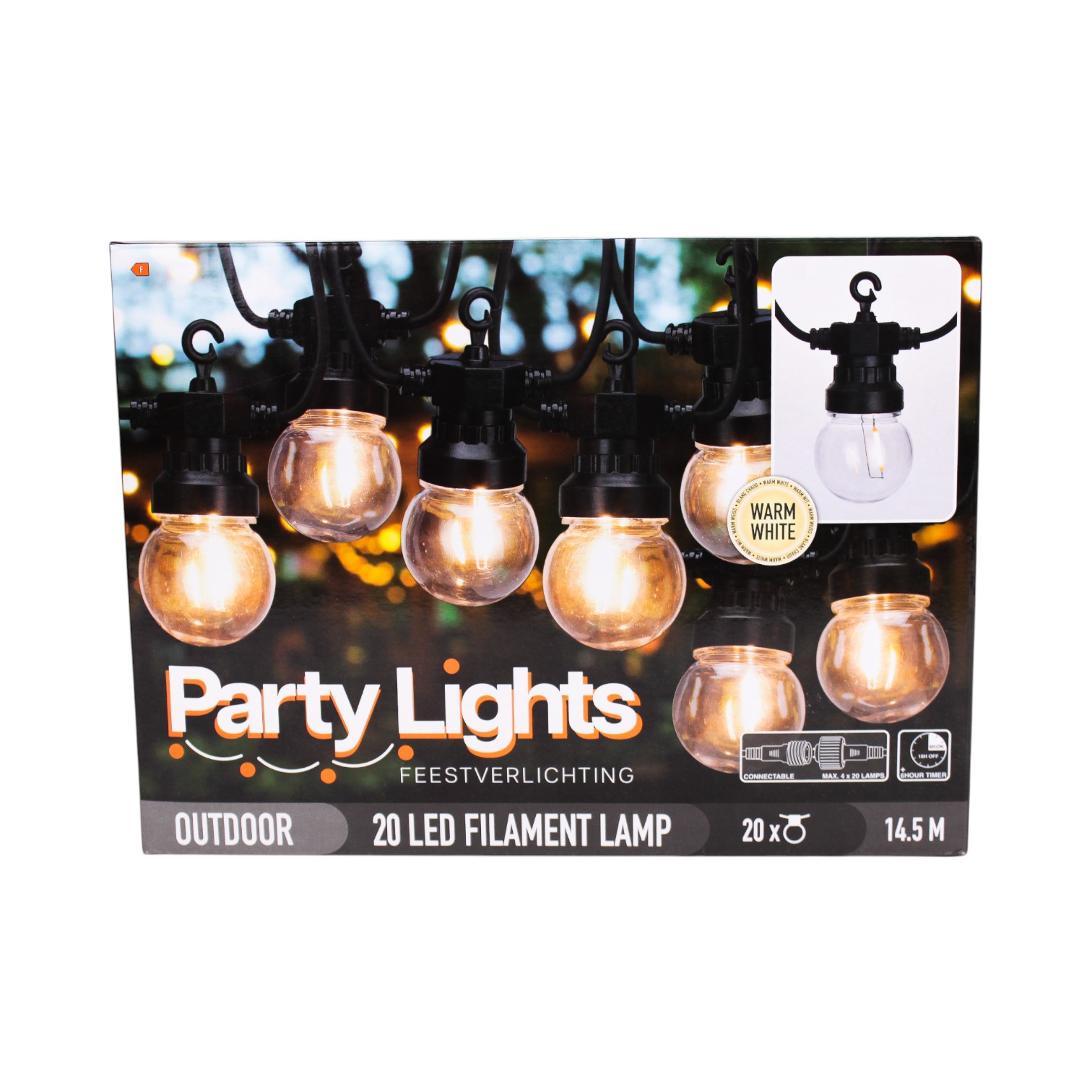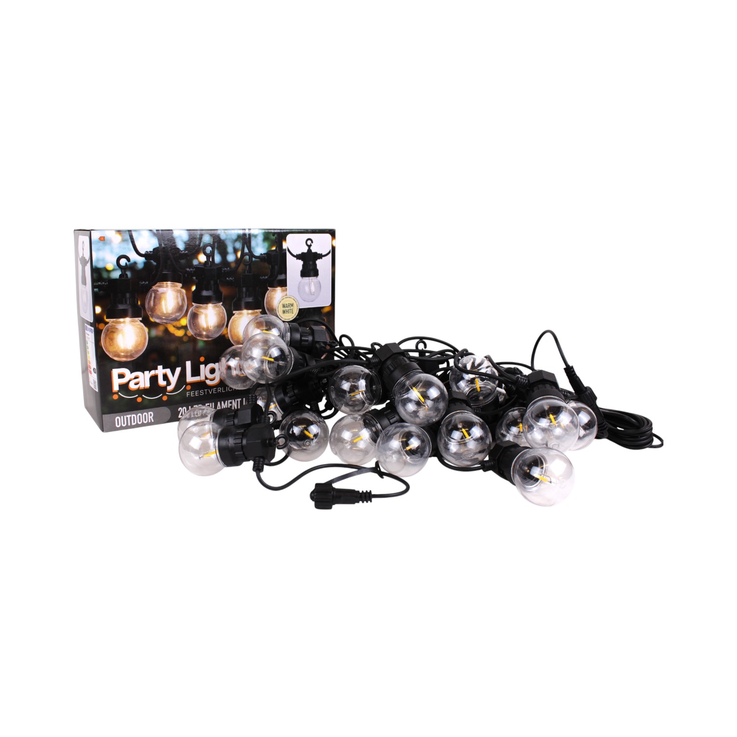 Machen Sie Ihr Fest unvergesslich mit dieser Lichterkette mit transparenten Glühbirnen, die ein warmes, einladendes Licht werfen. Jede Glühbirne ist mit einem Haken ausgestattet, der das Aufhängen der Lichterkette erleichtert. Die 20 Glühbirnen bieten eine schöne Beleuchtung, sowohl für den Innen- als auch für den Außenbereich. Die Lichterkette ist mit einem Timer ausgestattet und kann verlängert werden, was sie perfekt macht, um die richtige Feststimmung zu schaffen. Details: Anzahl der Glühbirnen: 20 Lichtfarbe: Warm weiß Timerfunktion: 6 Stunden an / 18 Stunden aus Kann verlängert werden: ja Glühbirnendurchmesser: 5 cm Abstand zwischen den Glühbirnen: 50 cm Länge mit Glühbirnen: 9,5 Meter Gesamtlänge: 14,5 Meter Lichtquelle: LED IP-Klassifizierung: IP44 (geeignet für den Außenbereich)