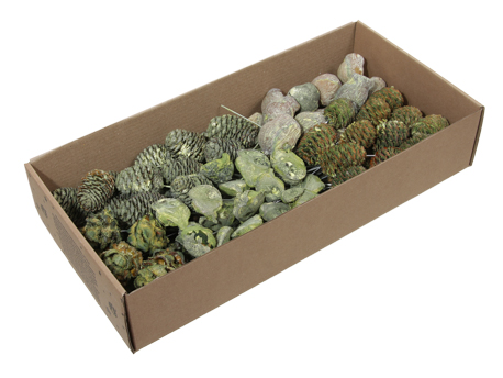 Schachtel mit verschiedenen getrockneten Zapfen, Blumen, Früchten und Samenständen in Natur, Weiß, Gold, Silber, Cremefarben oder gebleicht in großen Mengen. Erhältlich in großen Schachteln, sowohl gemischt als auch mit einheitlichen Produkten.
