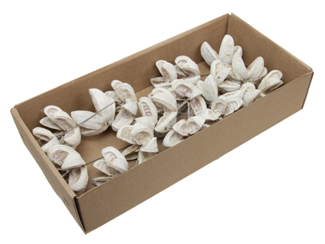Getrocknete Fröschalen in Bündeln zu 6 Stück auf Draht. WEIß für Dekorationen.