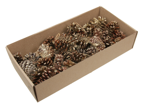 Schachtel mit verschiedenen getrockneten Zapfen, Blumen, Früchten und Samenständen in Natur, Weiß, Gold, Silber, Cremefarben oder gebleicht in großen Mengen. Erhältlich in großen Schachteln, sowohl gemischt als auch mit einheitlichen Produkten.