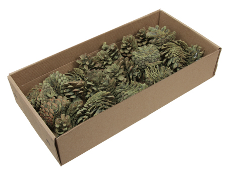 Die kleinen grün gewaschenen Kiefernzapfen sind geeignet für Dekorationen und Großproduktionen zum Weiterverkauf.