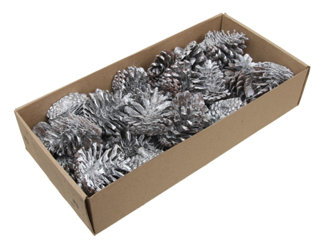 Die kleinen silberfarbenen Fichtenzapfen sind geeignet für Dekorationen und Großproduktionen zum Weiterverkauf.