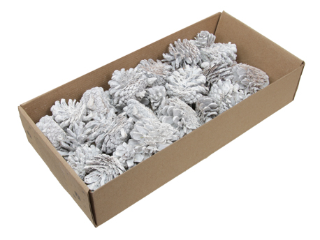Die kleinen weißen Kiefernzapfen sind geeignet für Dekorationen und Großproduktionen zum Weiterverkauf.