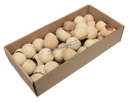 Schachtel mit verschiedenen getrockneten Zapfen, Blumen, Früchten und Samenständen in Natur, Weiß, Gold, Silber, Cremefarben oder gebleicht in großen Mengen. Erhältlich in großen Schachteln, sowohl gemischt als auch mit einheitlichen Produkten.
