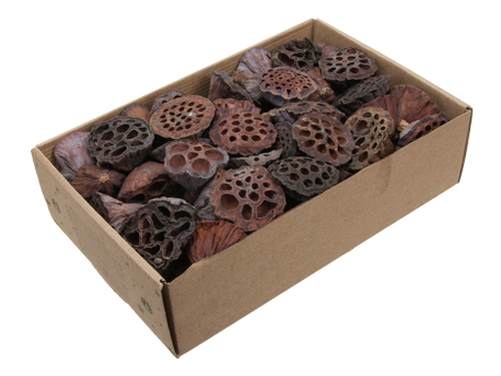 Lotus, gemischte Größen, natürlich braun. Naturdekoration – 80 Stück in der Box. Die Lotusfruchtkapseln sind in verschiedenen Größen. Die braunen Kapseln sind geeignet für Dekorationen und Großproduktionen zum Weiterverkauf. Die Box ist aus starkem Recyclingpapier mit transparentem Deckel. Misst 18 x 29 cm.