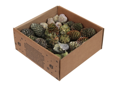 Schachtel mit verschiedenen getrockneten Zapfen, Blumen, Früchten und Samenständen in Natur, weiß, Gold, Silber, cremefarben oder gebleicht im Großhandel. Erhältlich in großen Schachteln, sowohl gemischt als auch mit gleichen Produkten.