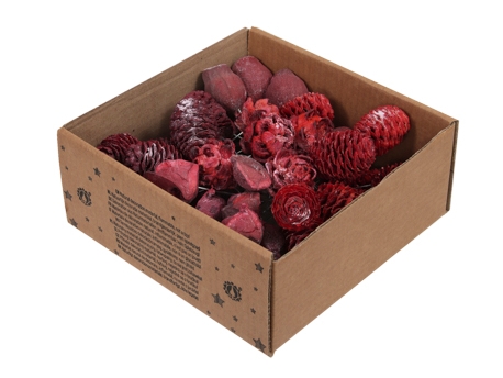 Schachtel mit verschiedenen getrockneten Zapfen, Blumen, Früchten und Samenständen in Natur, weiß, Gold, Silber, cremefarben oder gebleicht im Großhandel. Erhältlich in großen Schachteln, sowohl gemischt als auch mit gleichen Produkten.