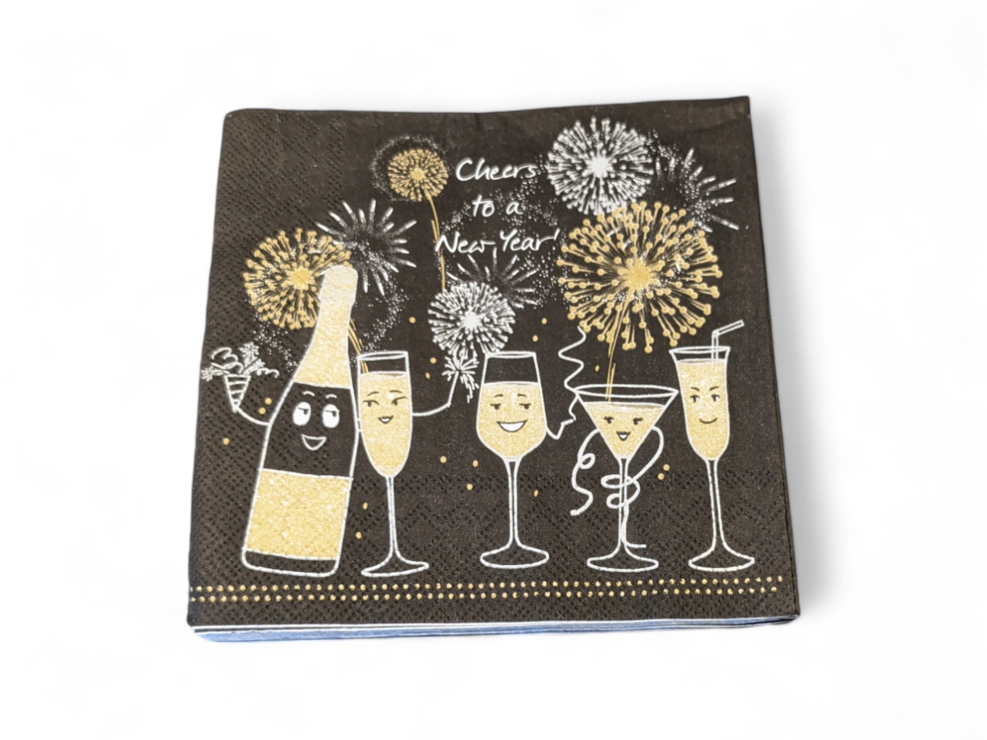Schwarze Servietten mit Gold- und Silber-NEUJAHRSFEUERWERK und „Cheers to a New Year“ Die NEUJAHRSERVIETTEN sind in Mittagsgröße, 33 x 33 cm. Die SERVIETTEN haben Druck auf allen 4 Quadraten und sind im Qualitätsmarke ASP-Holmblad. Es gibt 20 Stück pro Packung. Das Motiv auf den SERVIETTEN ist mit wasserbasierten Druckfarben gemacht und ist aus kompostierbarem Material. Chlorfreie Bleichung. Du kannst viele verschiedene Arten von SERVIETTEN für NEUJAHR hier kaufen.