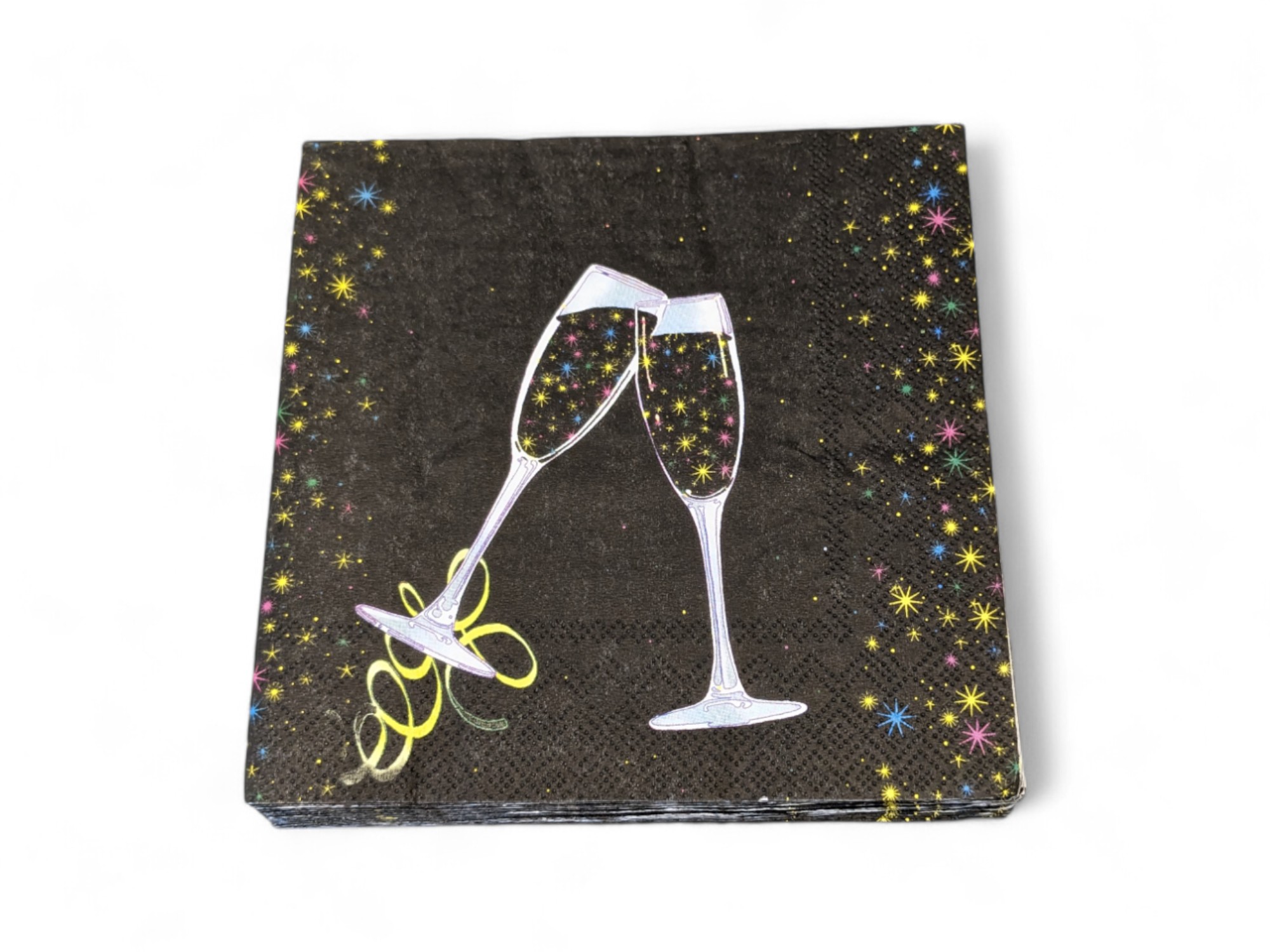 Schwarze Servietten mit zwei anstoßenden Gläsern Champagner mit farbenfrohen Sternen. Die Neujahrsservietten sind in Mittagsgröße, 33 x 33 cm. Es gibt 20 Stk. pro Pk. Die Servietten haben Druck auf allen 4 Quadraten und sind in der Qualitätsmarke ASP-Holmblad. Das Motiv auf den Servietten ist mit wasserbasierten Druckfarben gemacht und aus kompostierbarem Material. Chlorfreie Bleiche. Du kannst viele verschiedene Arten von Servietten für Neujahr hier kaufen.