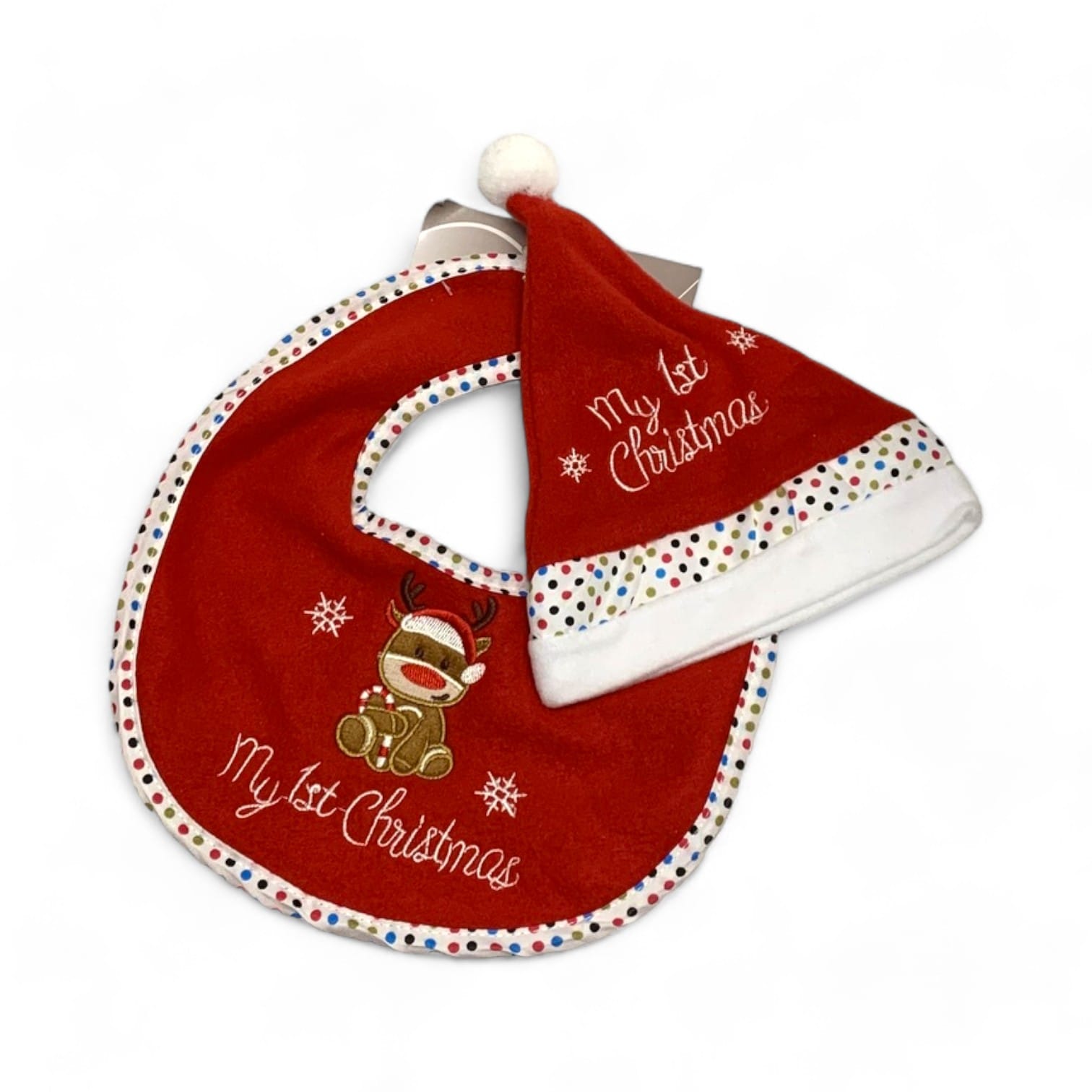 Süße Fleece-Weihnachtsmütze und Lätzchen mit Rentier für Babys im passenden Design.