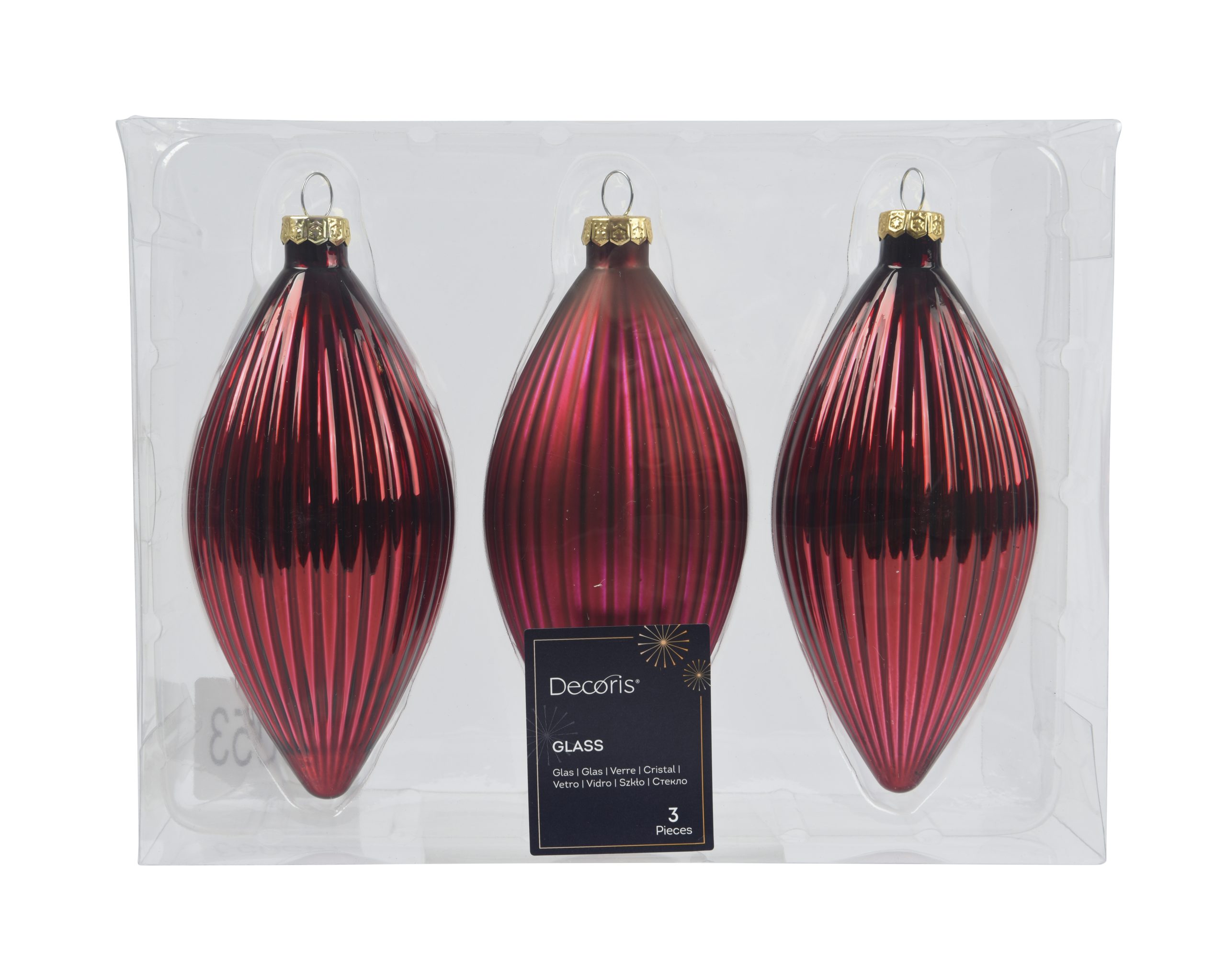 DUNKELROTE Weihnachtskugeln, zwei glänzende und eine matte, mit 13 cm und Durchmesser 6 cm. Die Glasweihnachtskugel hat eine spitze ovale Form, wie ein Tropfen oder eine Olive. Hängen Sie die Glaskugel im Fenster zusammen mit anderen Weihnachtskugeln in entsprechenden Nuancen und mit anderen Formen auf. Die Weihnachtskugel kann auch in einer Dekoration verwendet werden und wird natürlich super auf dem Weihnachtsbaum aussehen.