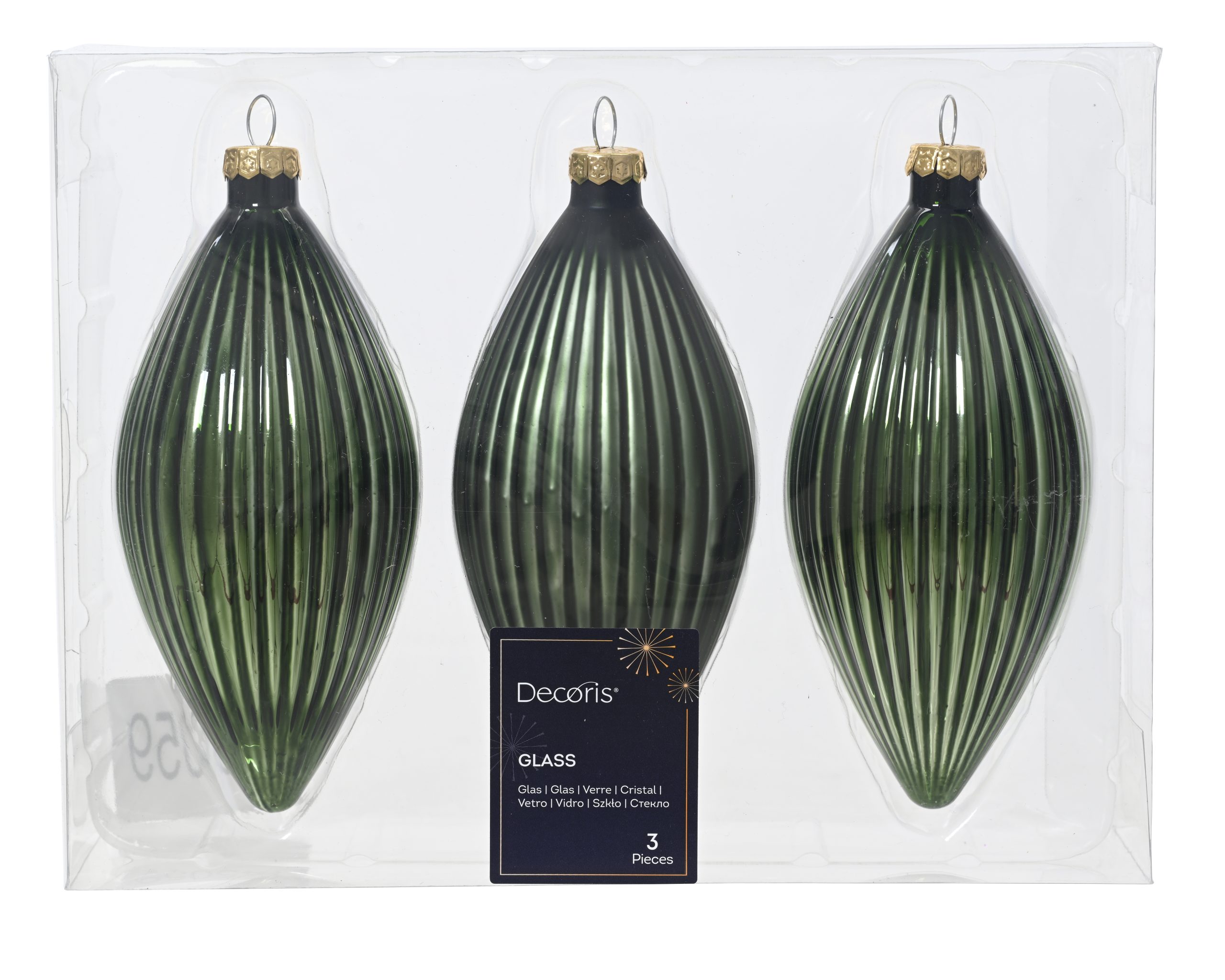 GRÜNE Weihnachtskugeln, zwei glänzende und eine matte, mit 13 cm und Durchmesser 6 cm. Die Glas-Weihnachtskugel hat eine spitze ovale Form, wie ein Tropfen oder Olive. Hängen Sie die Glaskugel im Fenster zusammen mit anderen Weihnachtskugeln in entsprechenden Nuancen und mit anderen Formen auf. Die Weihnachtskugel kann auch in einer Dekoration verwendet werden und wird natürlich super schön am Weihnachtsbaum sein.