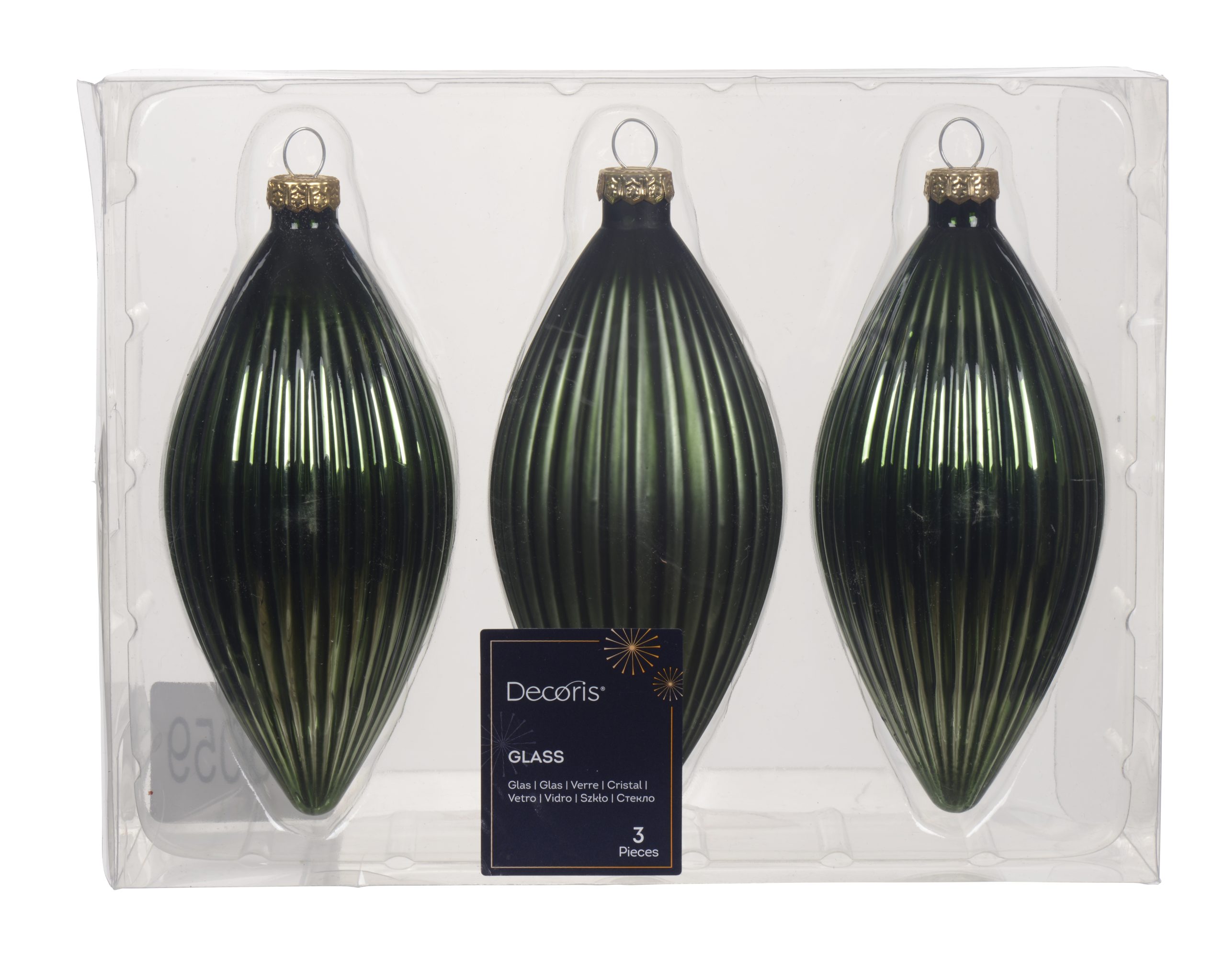 ROSMARIN GRÜNE Weihnachtskugeln, zwei glänzende und eine matte, mit 13 cm und Durchmesser 6 cm. Die Glas Weihnachtskugel hat eine spitze ovale Form, wie ein Tropfen oder Olive. Hängen Sie die Glaskugel im Fenster zusammen mit anderen Weihnachtskugeln in entsprechenden Nuancen und mit anderen Formen auf. Die Weihnachtskugel kann auch in einer Dekoration verwendet werden und wird natürlich super schön am Weihnachtsbaum sein.