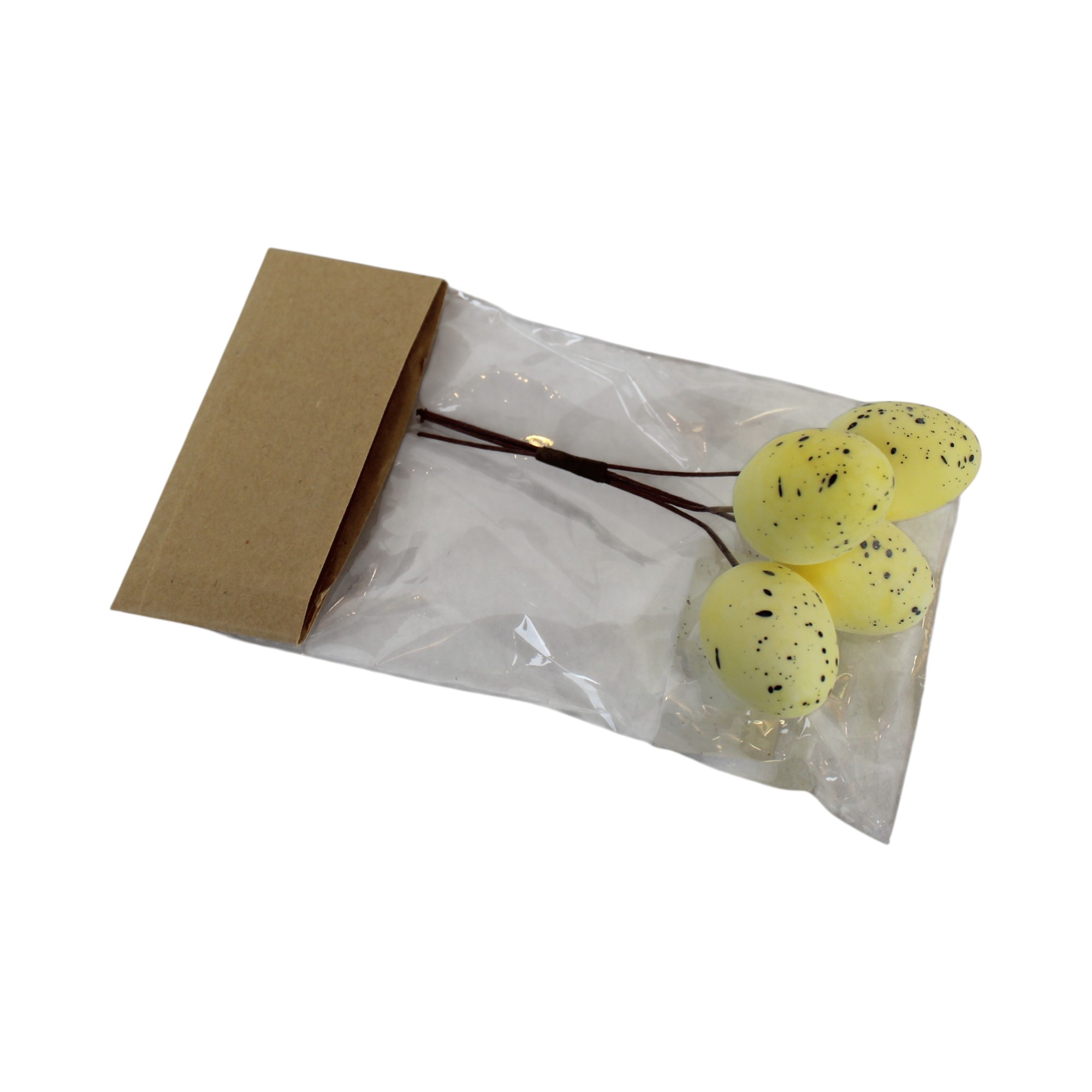 Gelbe Ostereier mit schwarzen Punkten zur Dekoration. Die Tüte enthält 4 pastellgelbe Eier, die 3,5 x 2,5 cm messen und einen Stiel von 9 cm haben. Die Eier sind aus Schaumstoff und Stahldraht gefertigt.
