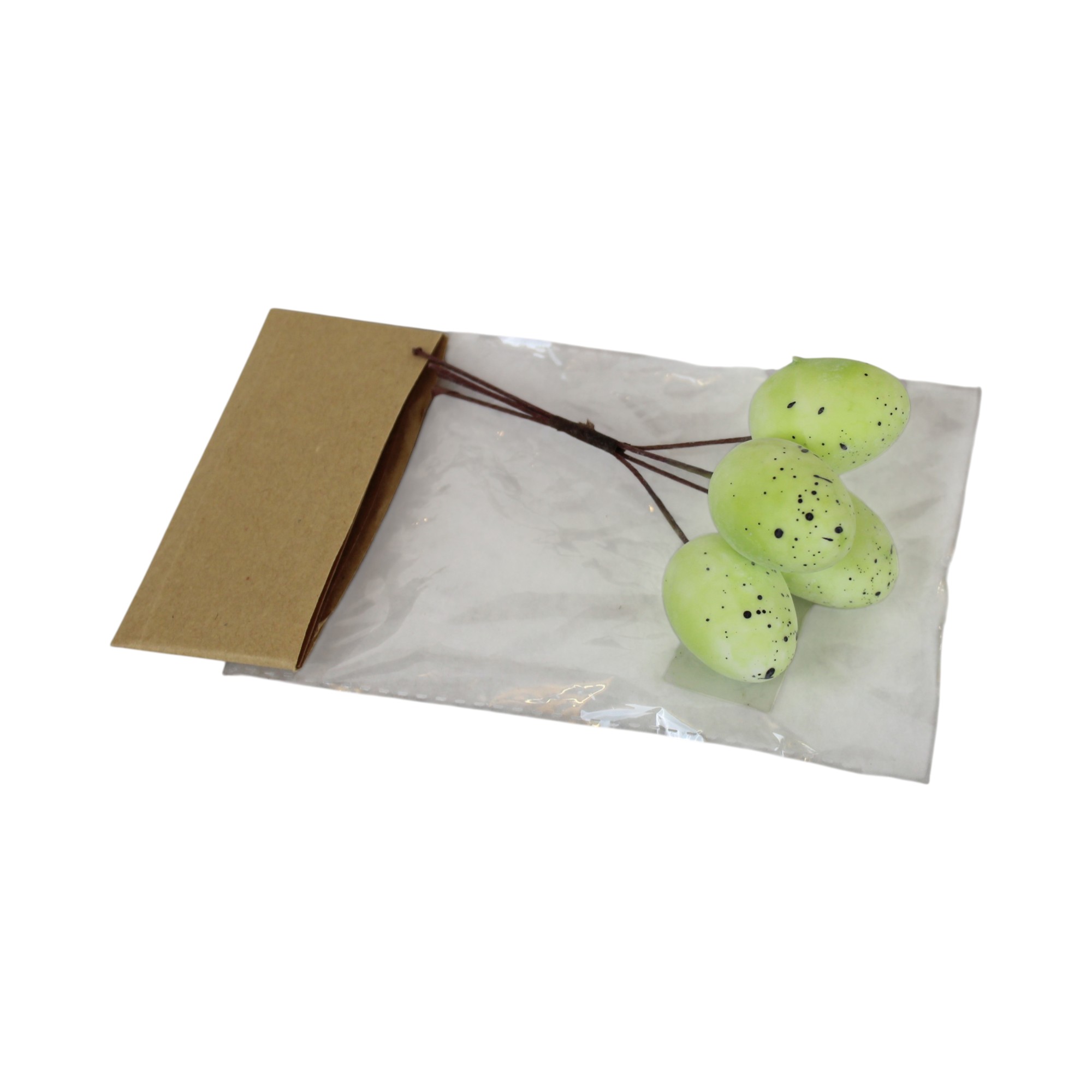 Grüne Ostereier mit schwarzen Punkten zur Dekoration. Die Tüte enthält 4 pastellgrüne Eier, die 3,5 x 2,5 cm messen und einen Stiel von 9 cm haben. Die Eier sind aus Schaumstoff und Stahldraht gefertigt.