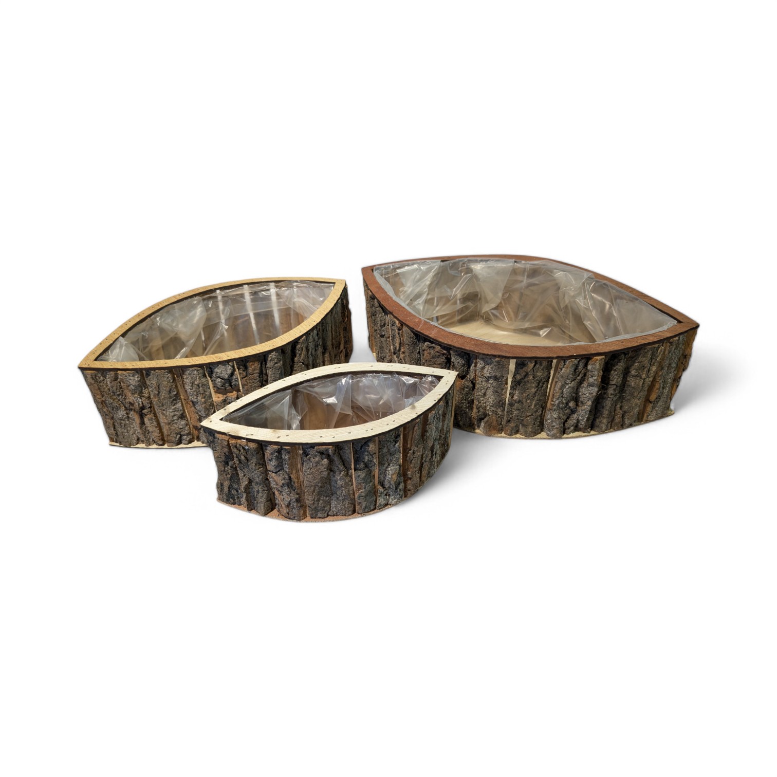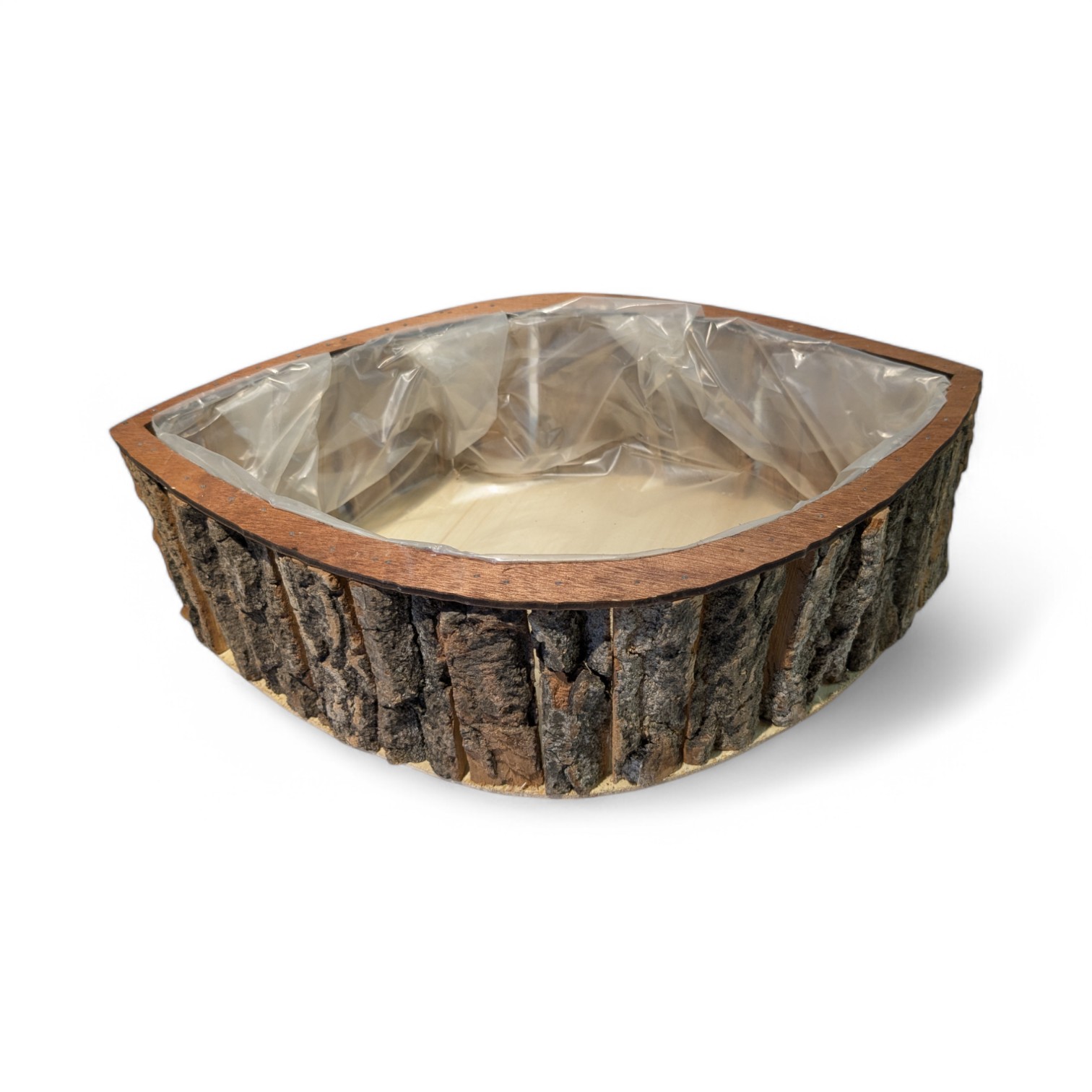 Ovale Korb mit Augenform und Plastik innen. Braun Natur Rinde außen. Durchmesser des Korbes ist 37 cm von Spitze zu Spitze. Höhe ca. 10,5 cm. Der Korb kann für nasse Dekorationen mit Oasis oder für Topfpflanzen verwendet werden.