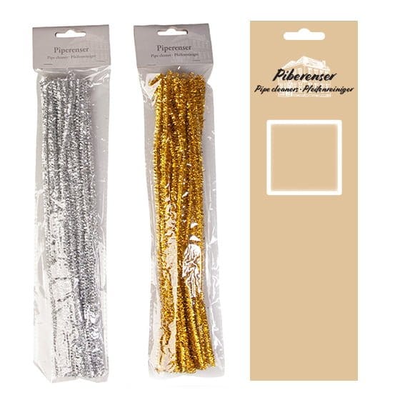 Pfeifenreiniger GOLD/SILBER Glitzer 30 Stück von Länge 30 cm. Durchmesser 0,6 cm. Gold- und silberfarbene Pfeifenreiniger in einem Mix mit 15 Stück von jedem, die für Weihnachtsschmuck und Weihnachtsdekoration sowie andere kreative Projekte verwendet werden können. Pfeifenreiniger werden auch Chenille genannt. Den günstigsten Preis im Netz finden Sie hier.