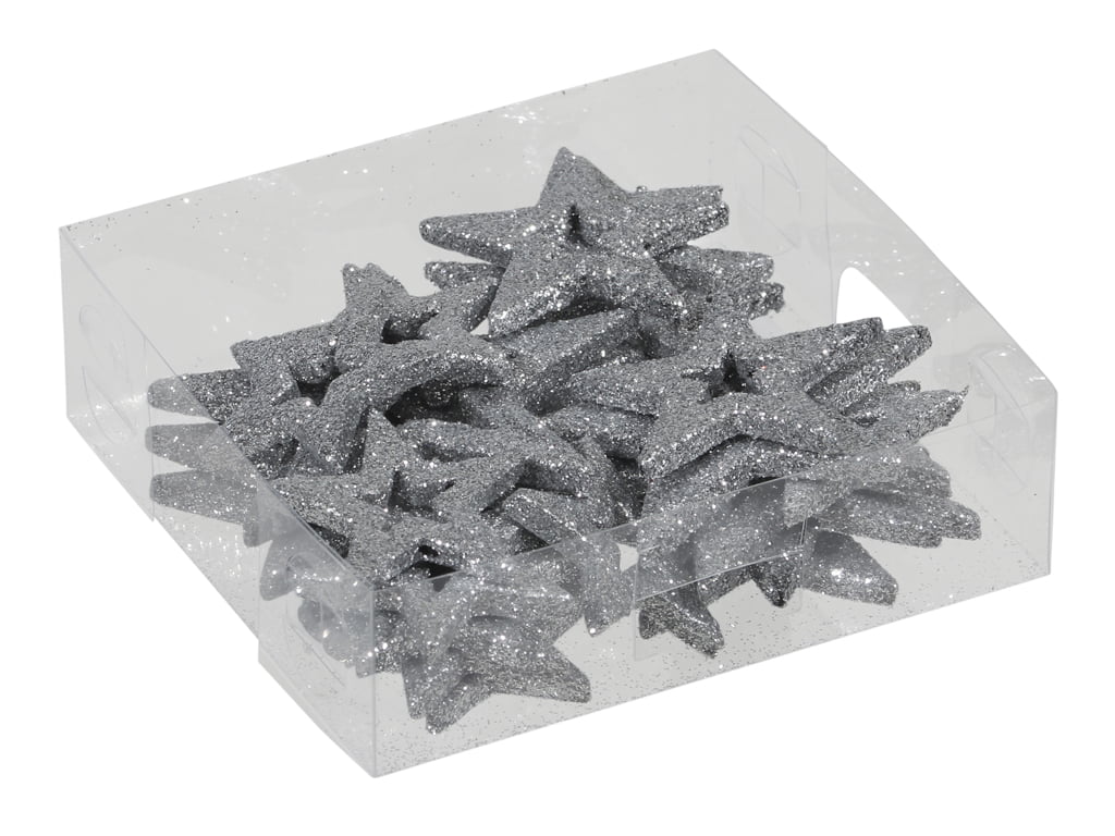 Die Glitzersterne in der Farbe Silber messen: 35/45/55/65 mm.