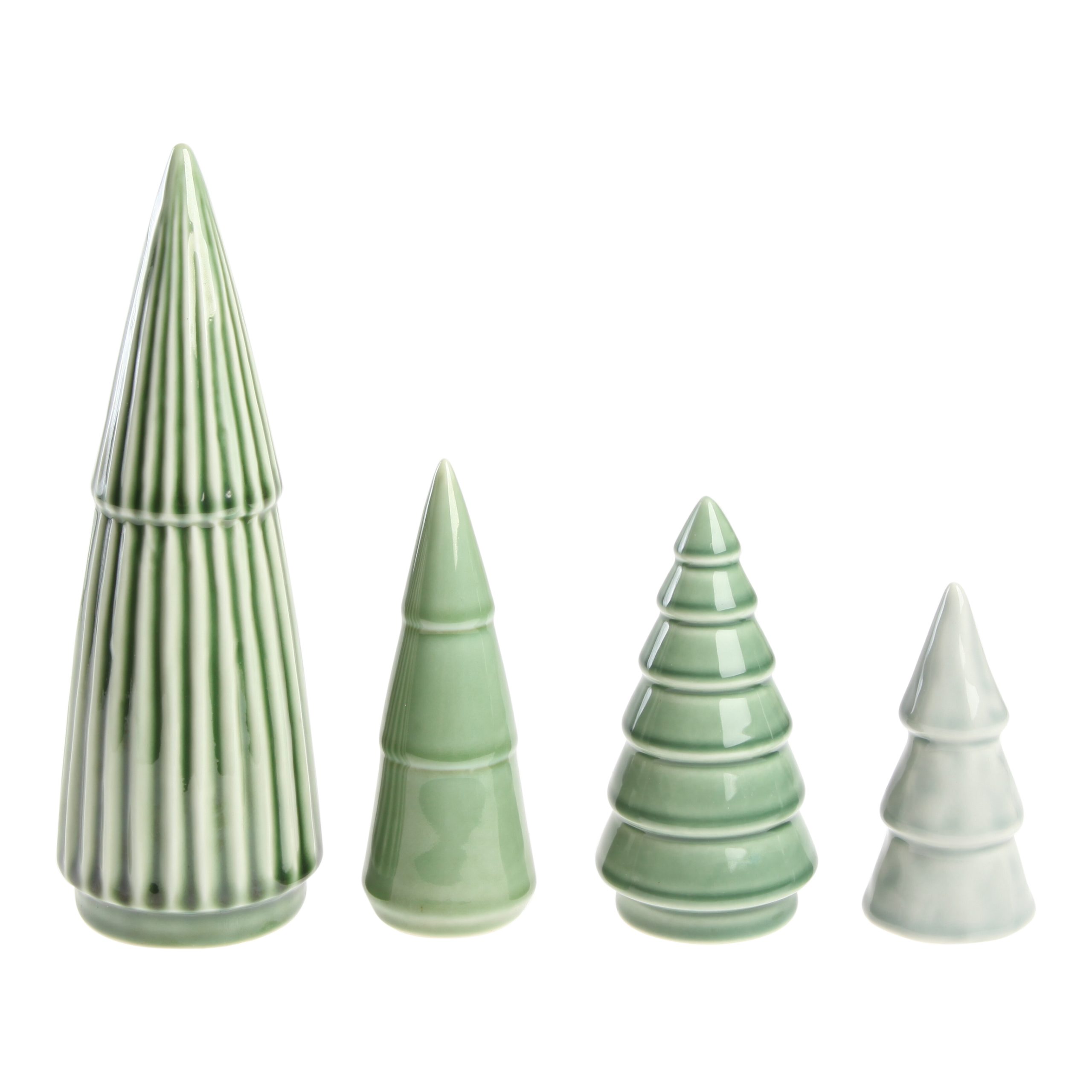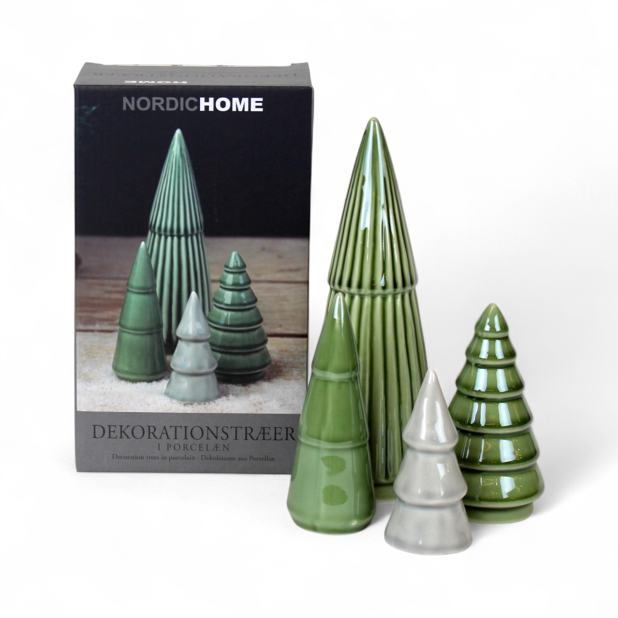 Weihnachtsbäume aus Porzellan. 4 verschiedene Weihnachtsbäume mit unterschiedlichen Formen und grünen und grauen Farben.