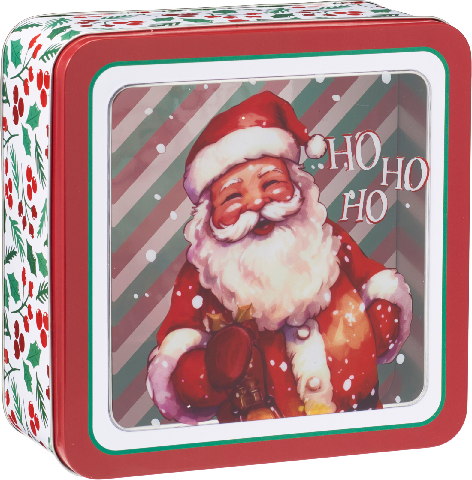 Quadratische Keksdose für Weihnachten mit weißem Grundfarbe mit Blättern und roten Beeren an den Seiten und schräggestreiftem Boden in der Dose. Die Weihnachtsdose hat einen transparenten Deckel mit Weihnachtsmann, der „Ho, Ho, Ho“ sagt, sowie einen roten Rand. Die Keksdose misst 19 x 19 cm und ist 8,5 cm hoch. Die Keksdose strahlt Weihnachten mit den schönen Weihnachtsfarben aus und ist als ein schönes Gastgebergeschenk mit selbstgebackenen Weihnachtsplätzchen gefüllt geeignet.