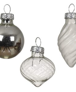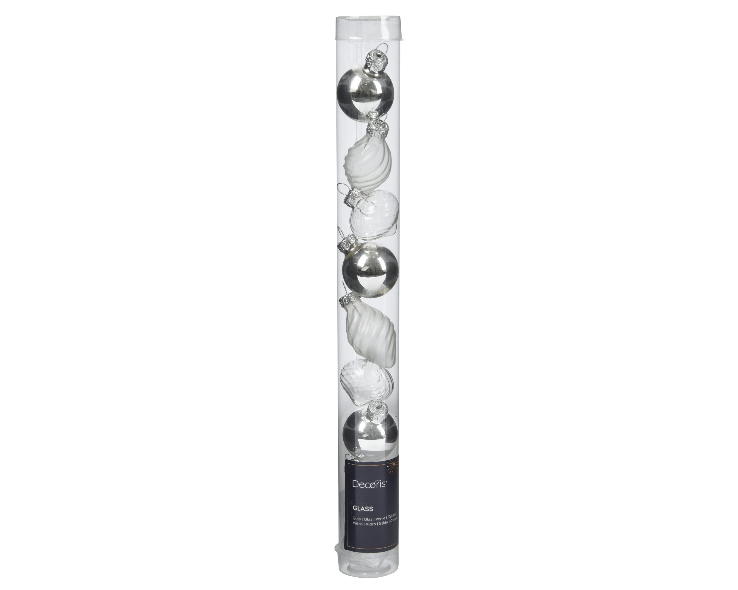 Röhr mit Glas-Weihnachtskugeln und Figuren in Ø3 in SILBER. 9 Stk.