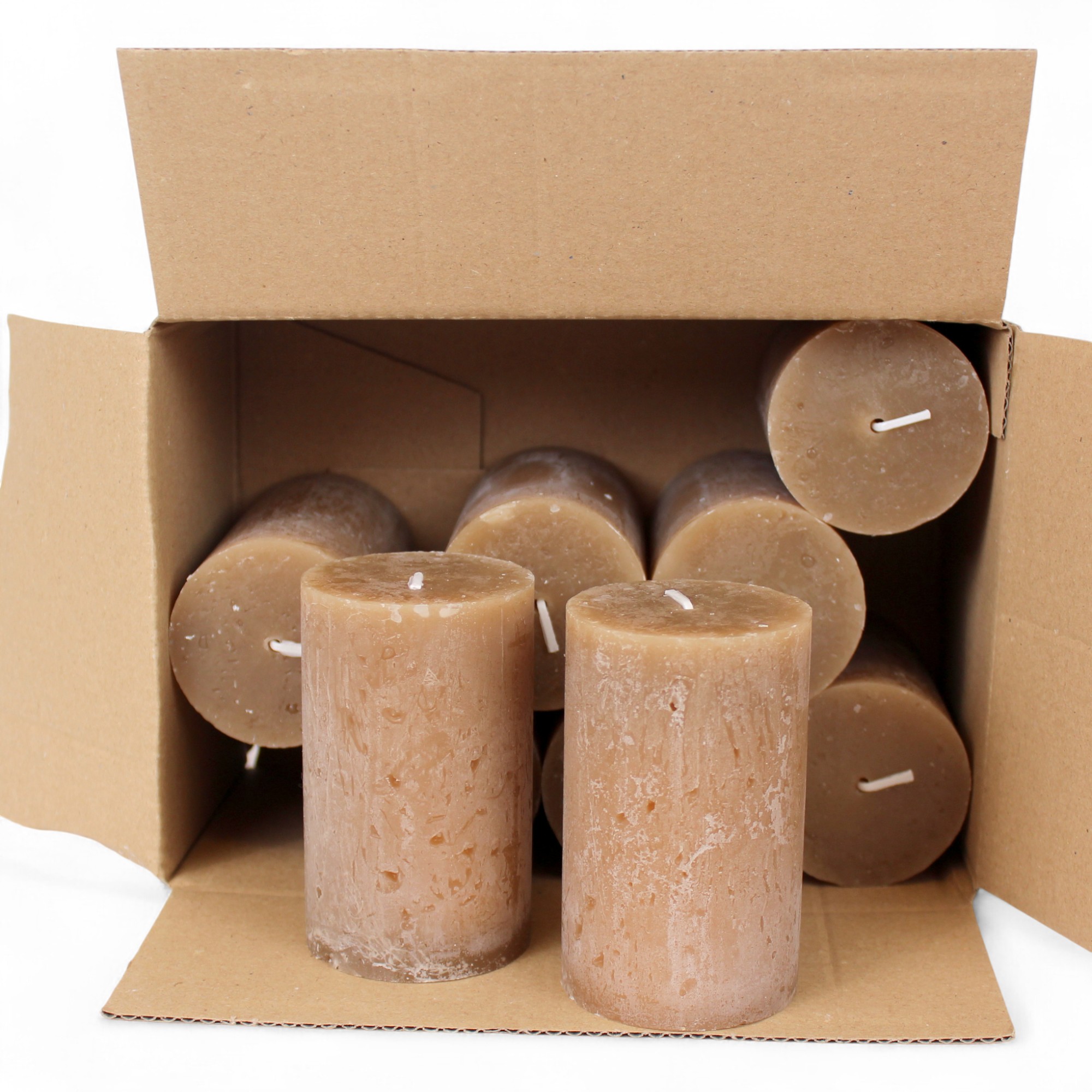 kasse med 9 styk kamel brune rustikke bloklys 10 centimeter høje og 6 centimeter i diameter gennemfarvede