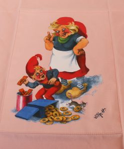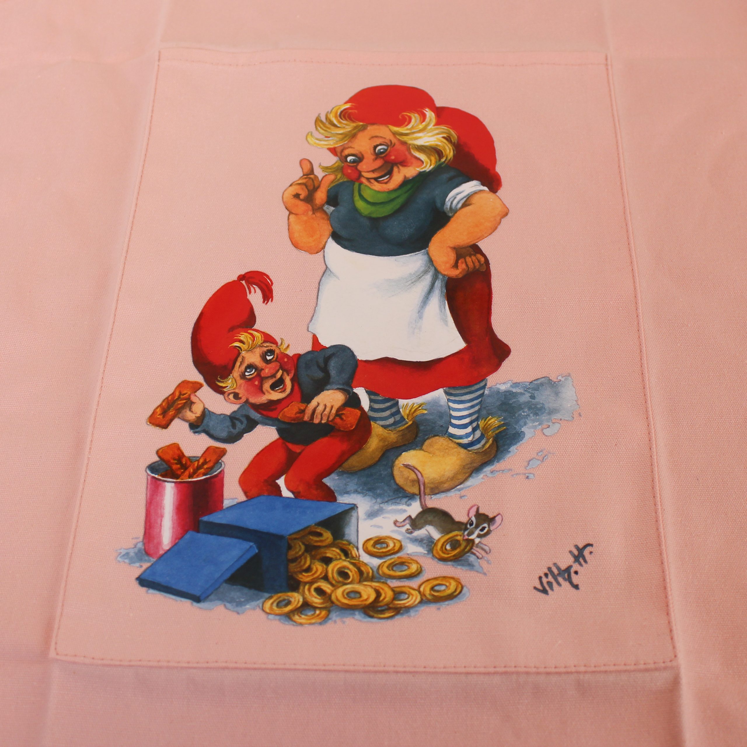 Schürze aus rosa Stoff mit Druck eines essensfreudigen Wichtels, einer Katze und einer Wurst – entworfen von Vilhelm Hansen.