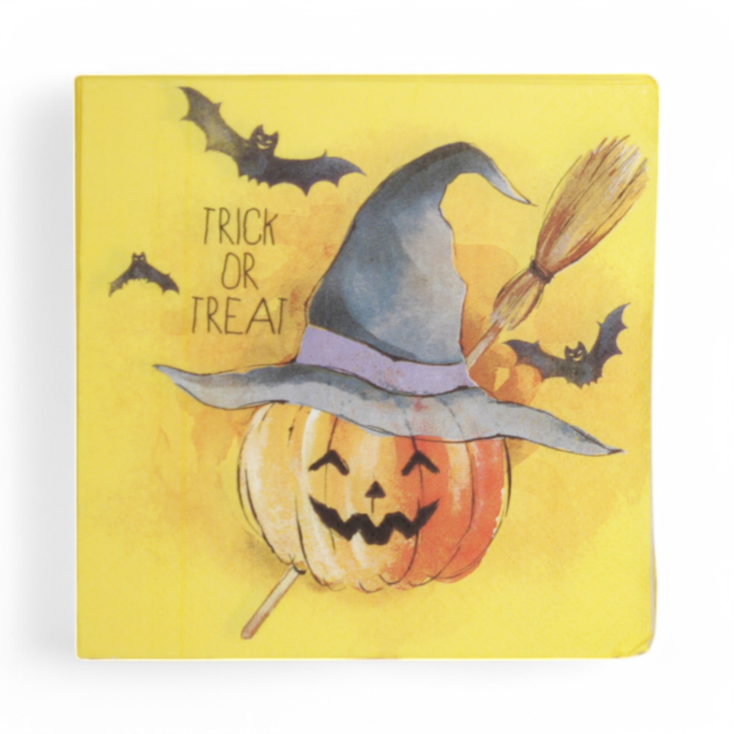 Servietten für Halloween mit Kürbis mit Hexenhut und Besen. Trick or Treat