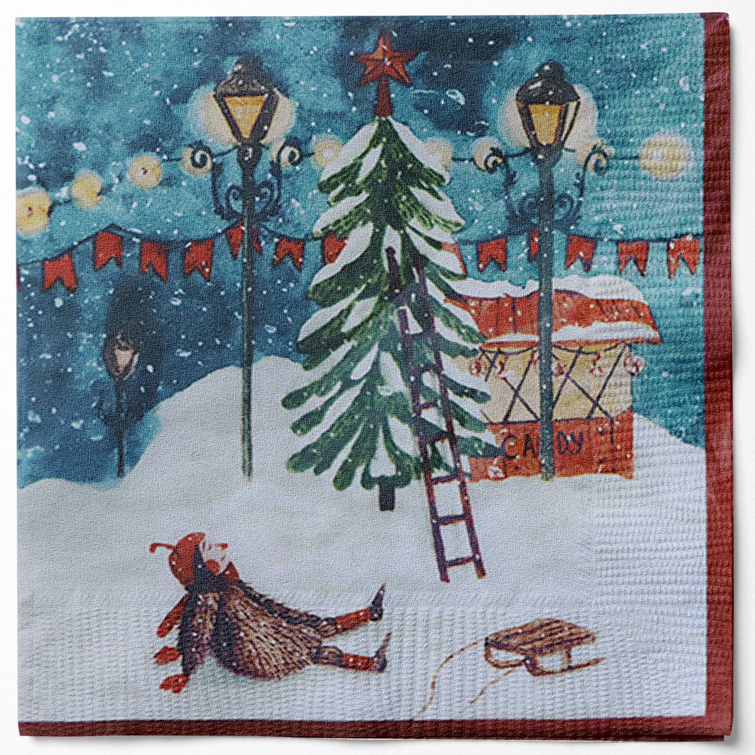 Servietten für Weihnachten, mehrfarbig mit Süßwarenladen, Weihnachtsbaum, Straßenlaternen und einem Mann, der von der Leiter gefallen ist. Weihnachtservietten, die nostalgische Weihnachten mit Schnee und gemütlichem Marktplatz ausstrahlen. Verwenden Sie die Mittagessenservietten, wenn Sie schöne Tische decken. Finden Sie einige, die zu Ihren Tischdecken passen, und haben Sie immer einige auf Lager. Verwenden Sie auch Servietten als Gastgebergeschenk, wenn Sie zu Besuch sind. Wir haben viele verschiedene Weihnachts- und Ganzjahresservietten zur Auswahl.