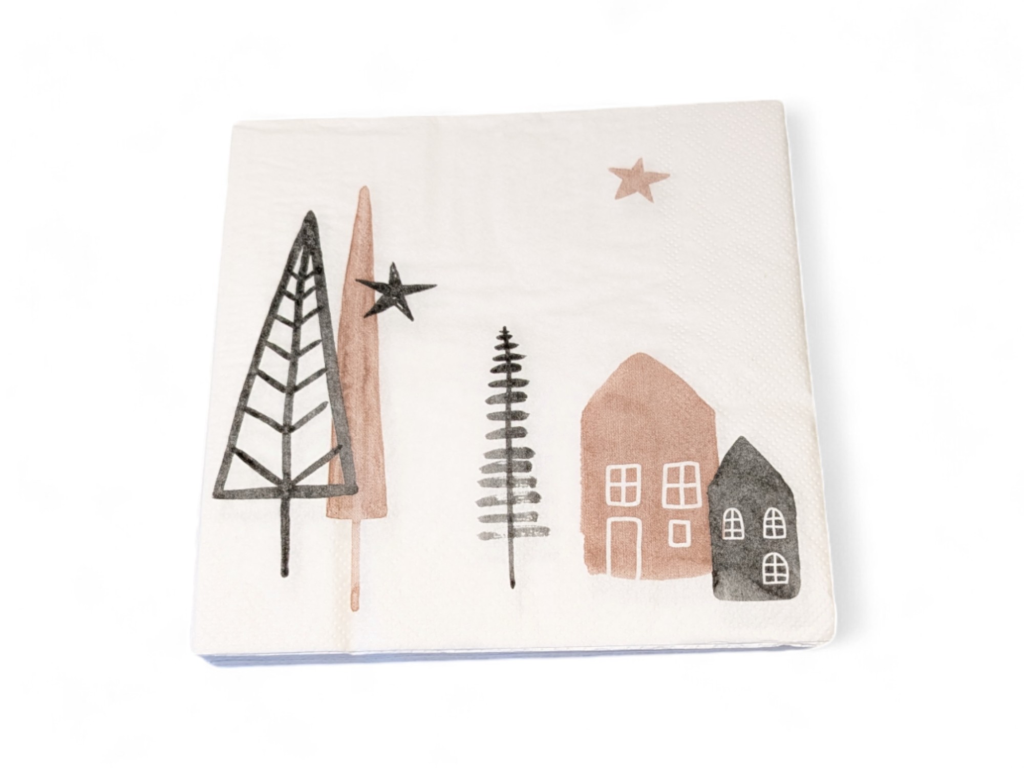 Weiße Serviette mit Häusern und verschiedenen Bäumen. Einfaches Design. Die Weihnachtsservietten sind in Mittagsgröße, 33 x 33 cm. Es gibt 20 Stk. pro Pk. Die Servietten haben Druck auf allen 4 Quadraten und sind in der Qualitätsmarke ASP-Holmblad. Das Weihnachtsmotiv auf den Servietten ist mit wasserbasierten Druckfarben hergestellt und aus kompostierbarem Material. Chlorfreie Bleichung. Du kannst viele verschiedene Arten von Weihnachtsservietten hier kaufen.