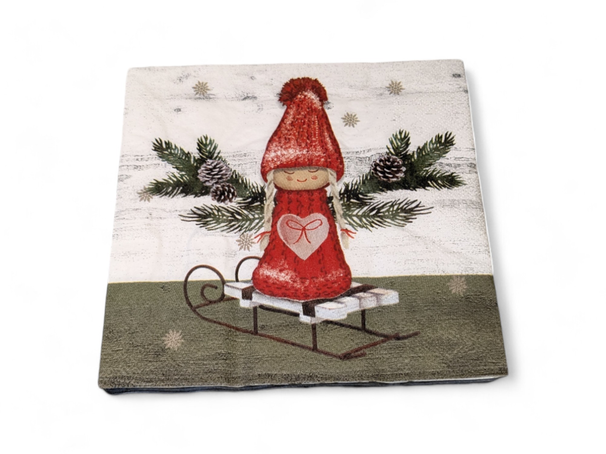 Servietten für WEIHNACHTEN. Weiß und grün mit einem Strickwichtel auf einem Schlitten. Mittagessen Größe. 20 Stk.