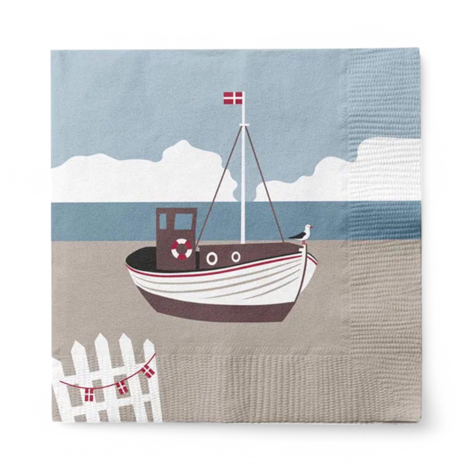Servietten mit Fischkutter am Strand. Servietten mit dänischem Motiv zur Konfirmation. 20 Stk. Mittagessen Servietten, die 33 x 33 cm messen. Die Servietten sind 3-lagig und haben Druck auf allen 4 Quadraten und sind FSC-gekennzeichnet (Umweltzeichen). Verwenden Sie diese Servietten auch als Gastgebergeschenk.