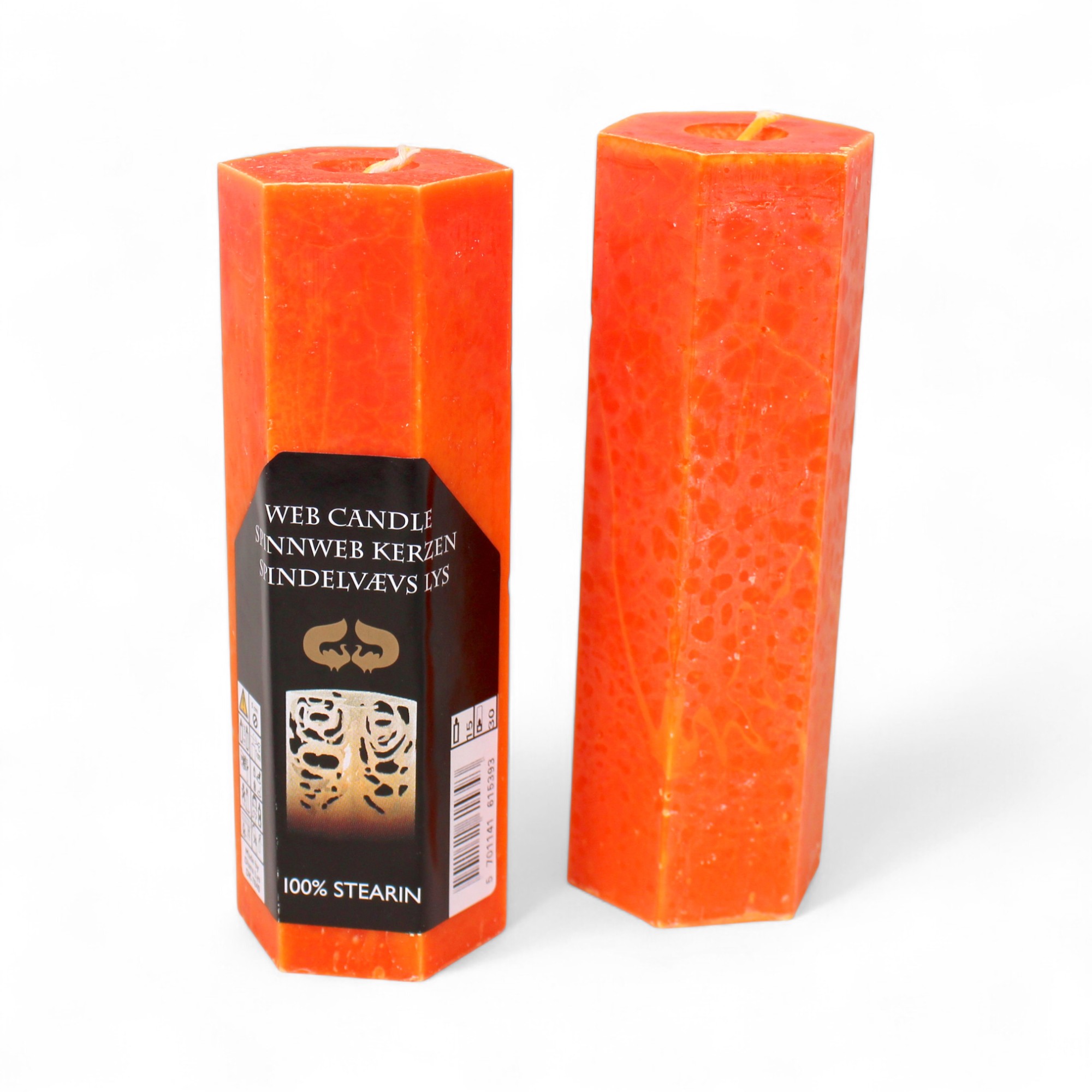 Spinnennetzkerze. Orange. Höhe 15 cm. Durchmesser 5 cm. 6-eckig. 100% Stearin. Brenndauer 30 Stunden. Die Spinnennetzkerze bildet das charakteristische Spinnennetzmuster, das die Kanten des Stearinlichts beim Brennen formen. Die schönen und kantigen Muster werfen Licht und Schatten in sehr einzigartige und schöne Formen. Diese Stearinkerze wird auch Spitzenkerze genannt.