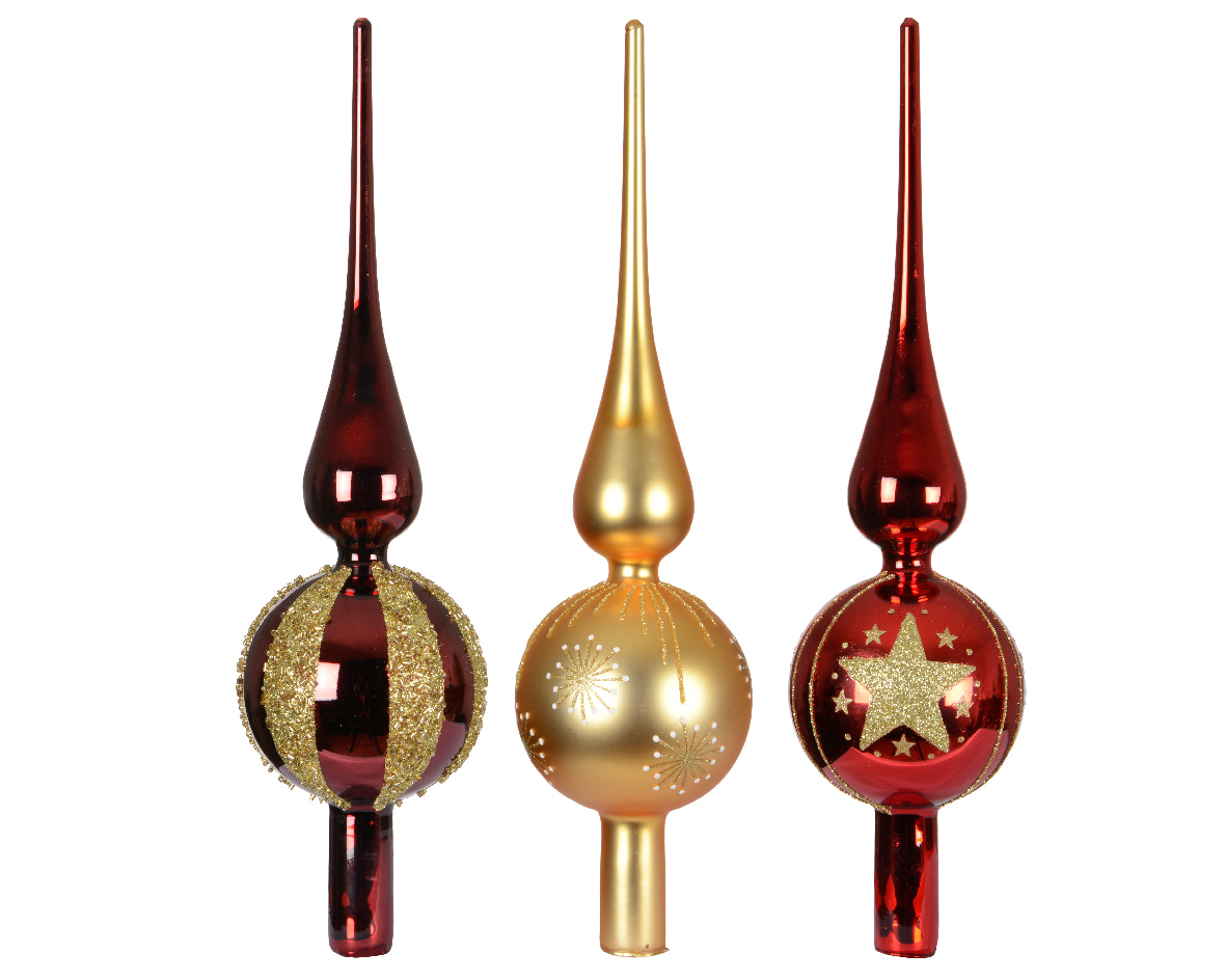 Die Form der Baumspitze ist mit Kugel unten mit Gold-Glitzer-Dekoration und gebogener Spitze nach oben. Dieser weihnachtsrote mundgeblasene Topper ist in anderen Varianten erhältlich.