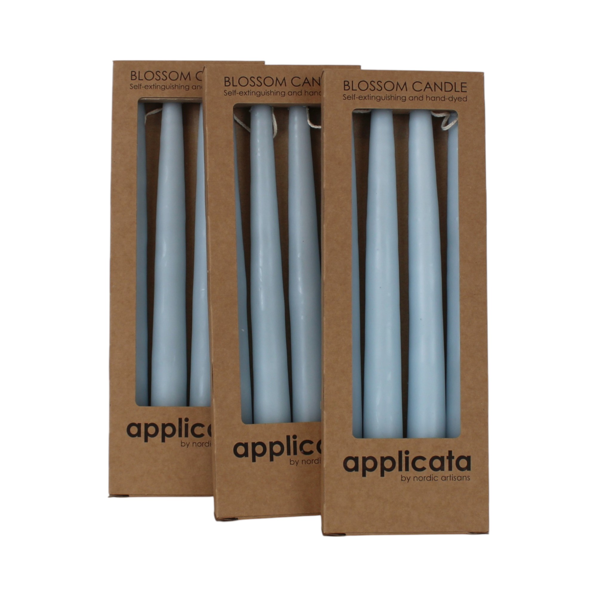 Getauchte hellblaue Stabkerzen in Schachtel. 6 Paare = 12 (stk.) Getauchte Kerzen sind paarweise zusammenhängend 2 und 2