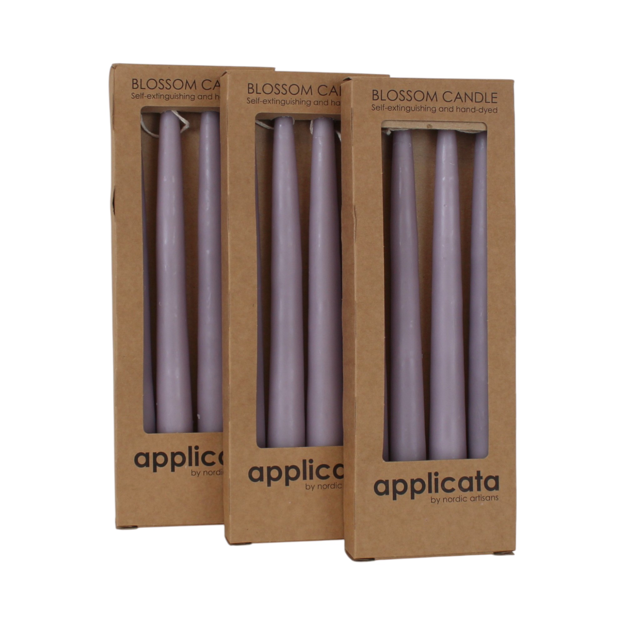 Getauchte lavendel-lila Stabkerzen in Schachtel. 6 Paare = 12 (stk.) Getauchte Kerzen sind paarweise zusammengehängt, 2 und 2.