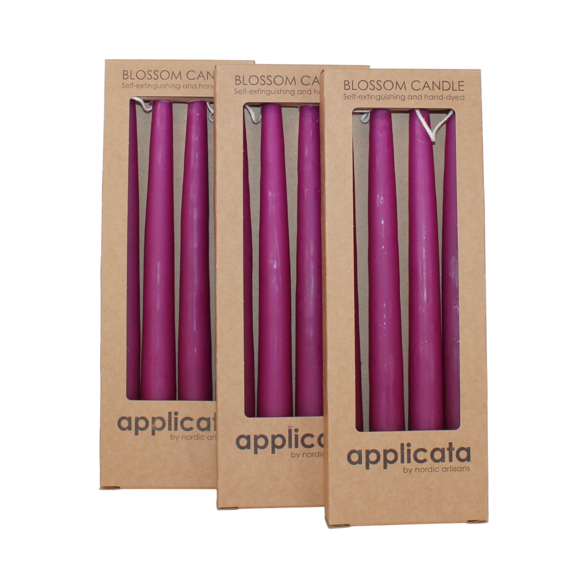 Getauchte magnolia-lila Stabkerzen in Schachtel. 6 Paare = 12 (stk.) Getauchte Kerzen sind paarweise zusammengehängt 2 und 2