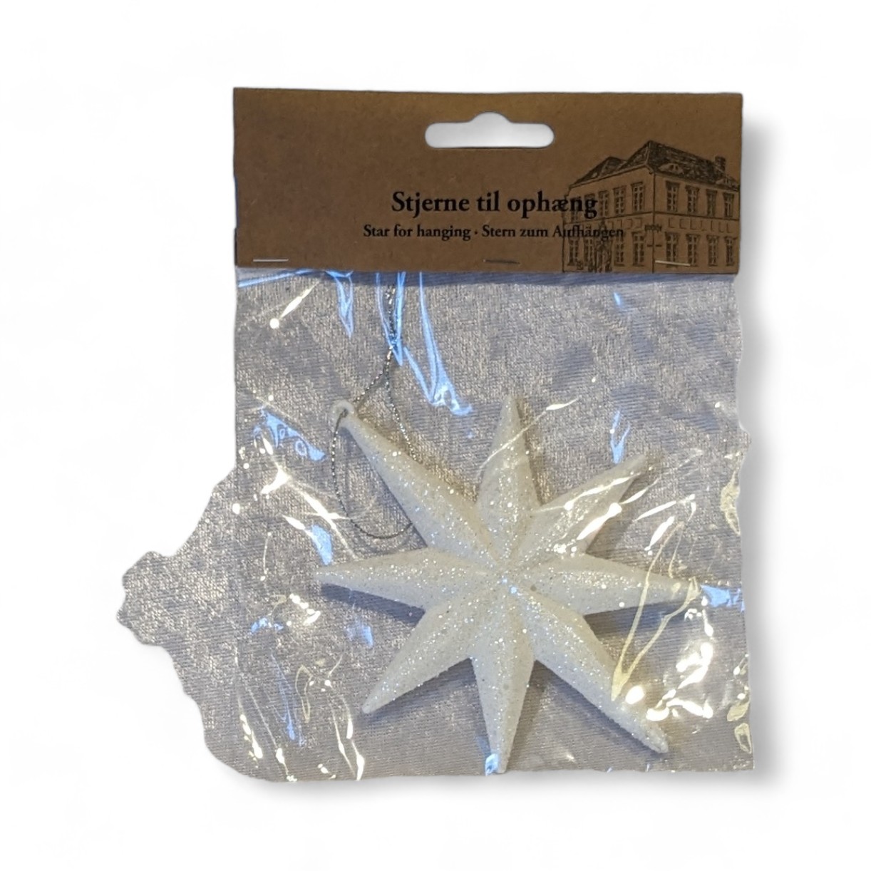 Der Glitzerstern misst 12 x 10 x 2 cm und hat eine silberne Schnur zum Aufhängen.