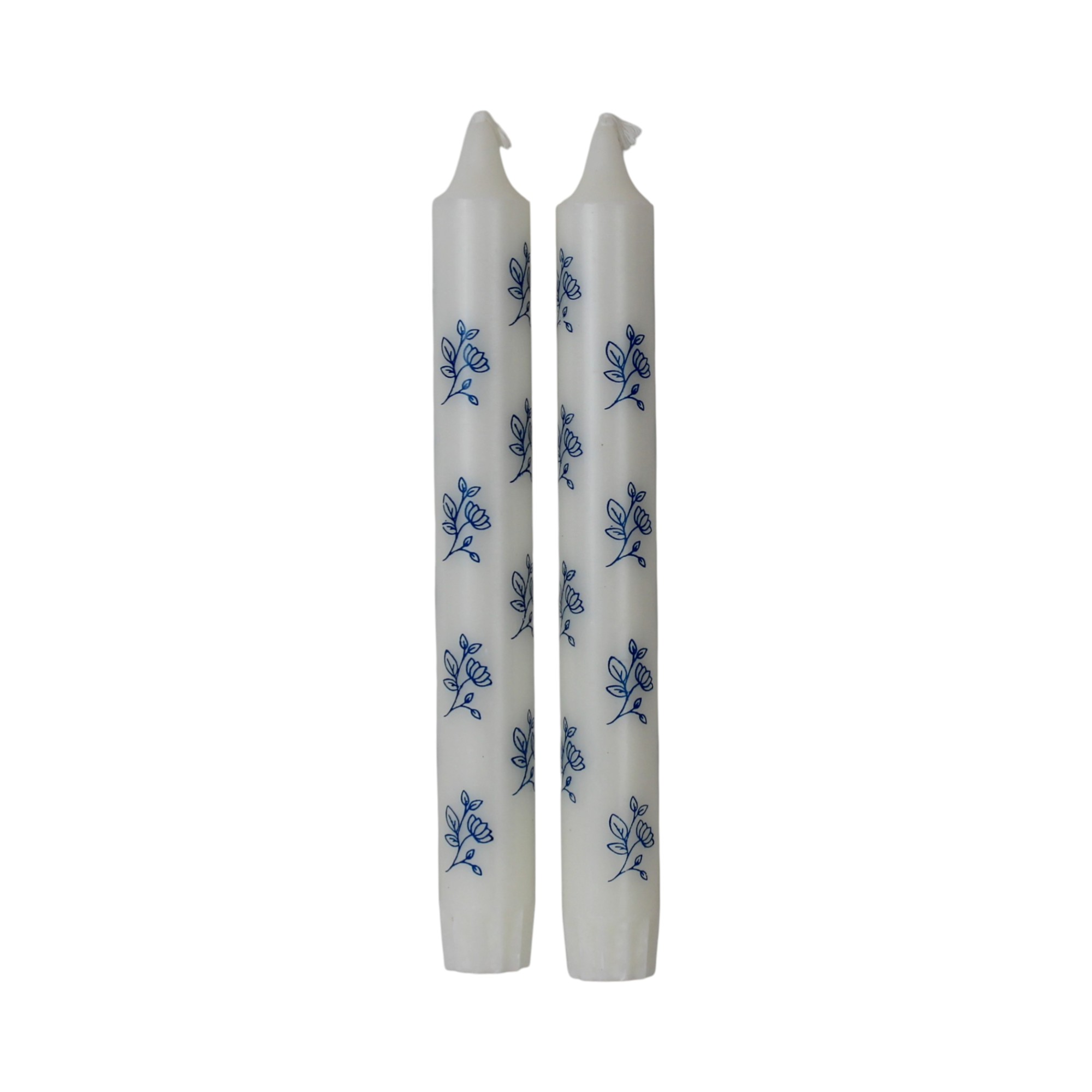 Tafelkerze mit Muster, weiß mit blauen Blumen, 100% reines Stearin, 19 cm (2 stk.)