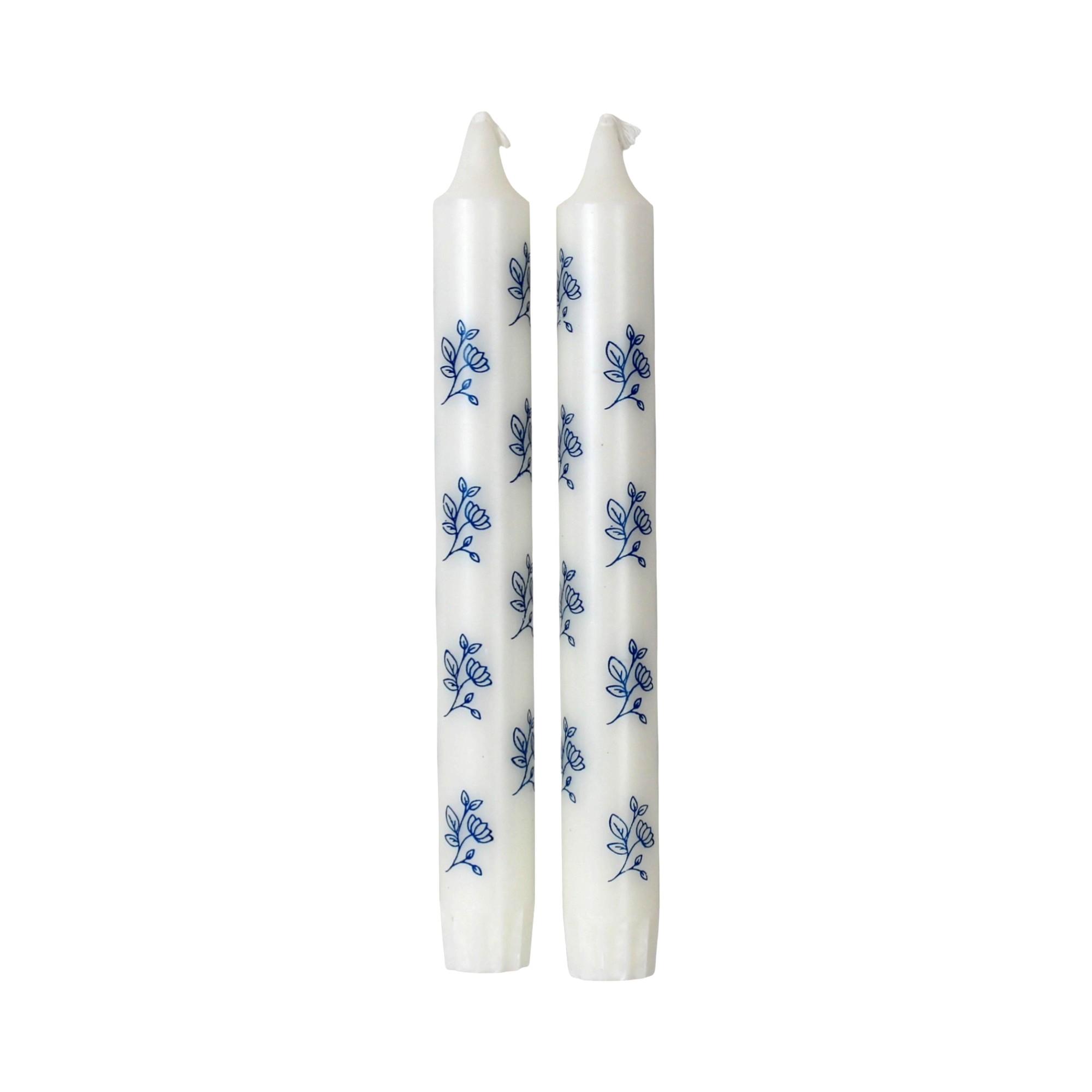 Tafelkerze mit Muster, weiß mit blauen Blumen, 100% reines Stearin, 19 cm (2 stk.)