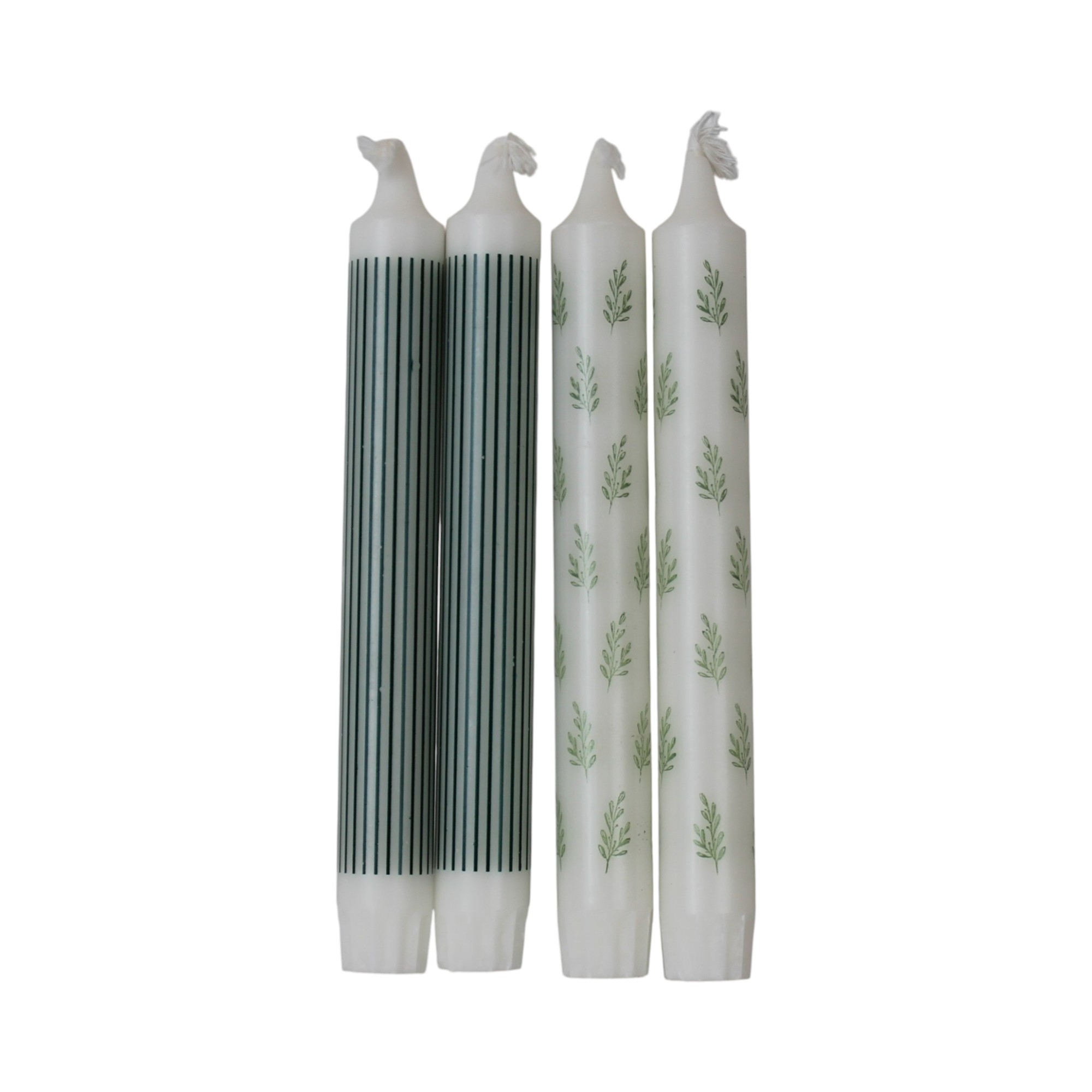 Tafelkerze mit Muster, weiß mit grünen Blättern, 100% reines Stearin, 19 cm (2 stk.)