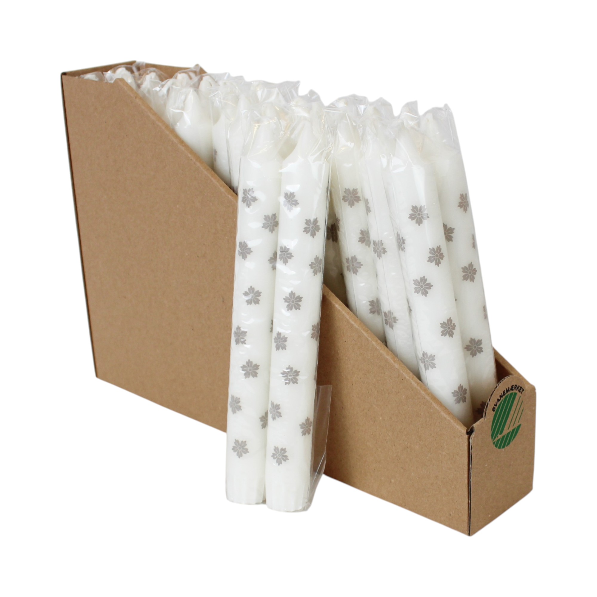 26 styk svanemærkede kronelys i hvid med sandfarvet blomstermønster på 19 centimeter