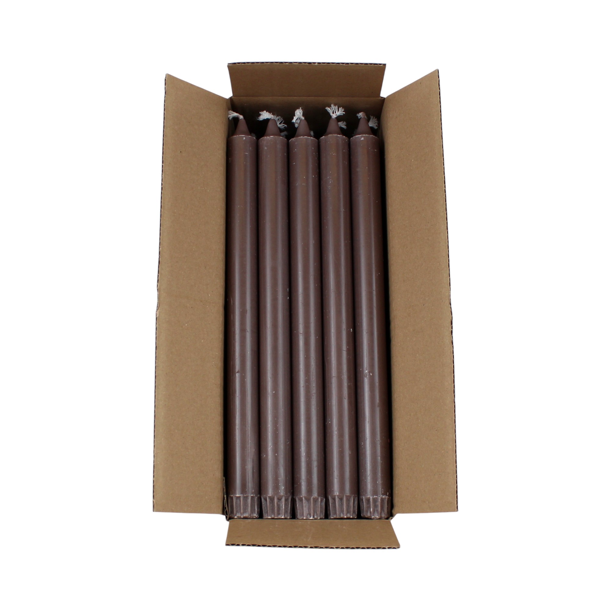 Die Stearin Kerzen sind durchgefärbt in staubigem Braun.