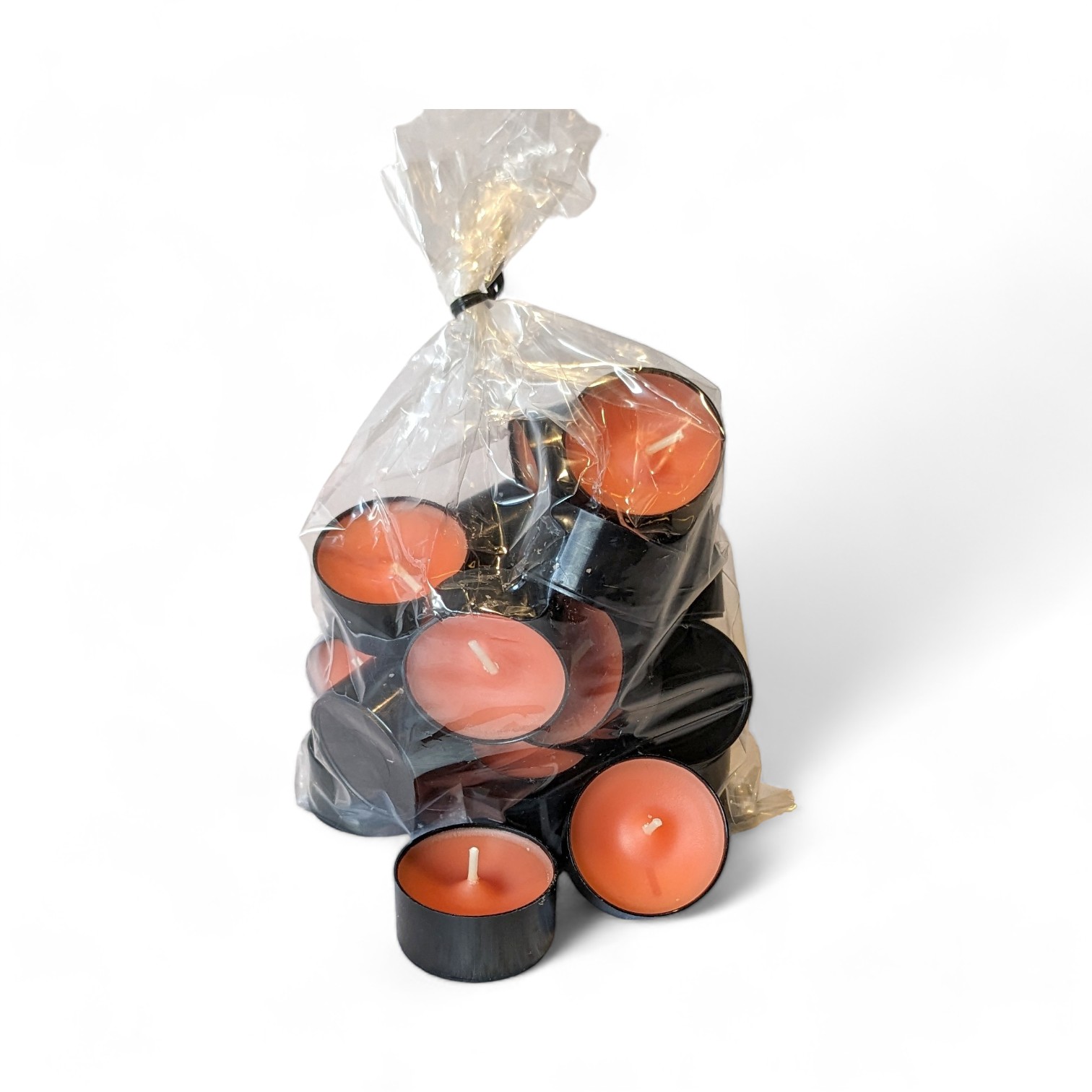 Teelichter, durchgefärbt ORANGE in schwarzer Plastikkappe. 20 Stück in Klarsichtbeutel.
