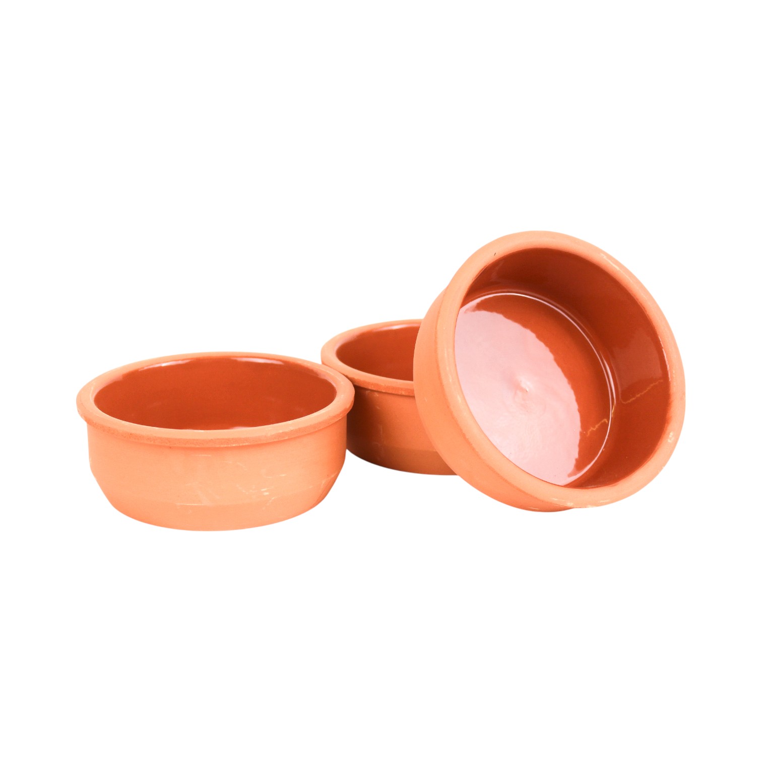 Terrakotta-Schalen, 12 cm im Durchmesser, sind perfekt zum Servieren von kleinen Gerichten oder Snacks. Mit einer glasierten Innenfläche sind sie sowohl stilvoll als auch praktisch. Sie sind spülmaschinenfest, mikrowellengeeignet und ofenfest bis 230 Grad. Das Paket enthält drei Schalen.