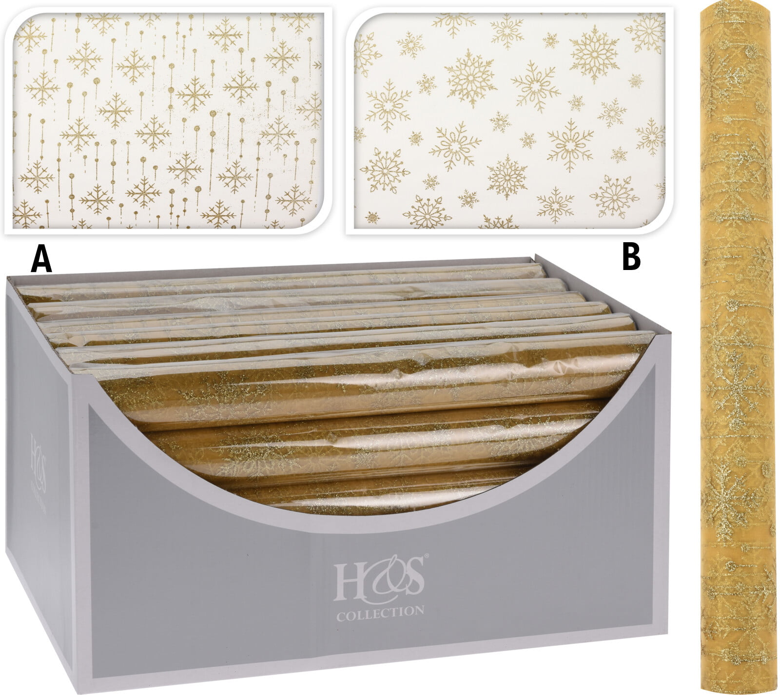 Tischläufer 36 x 200 cm. Schneeflocken in Organza, Gold