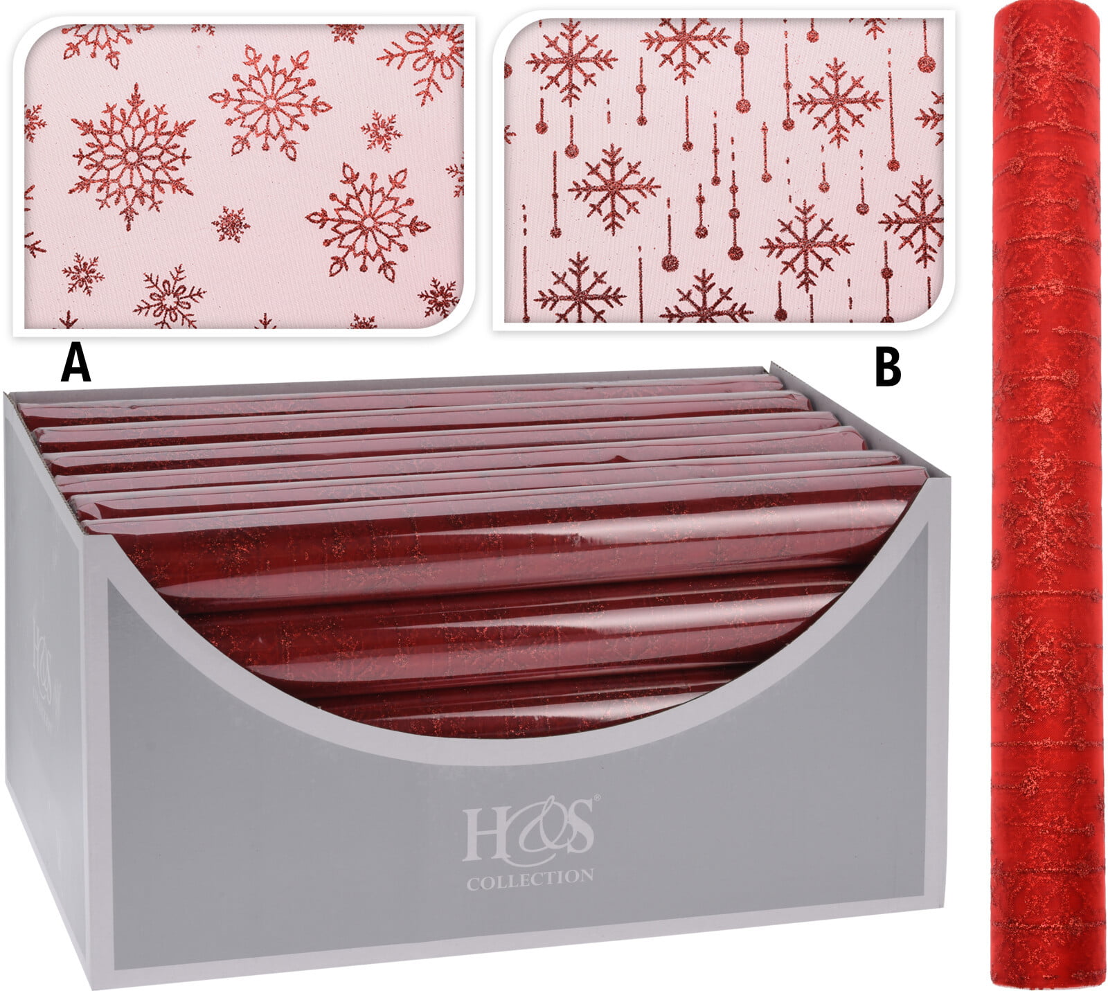 Schöner Tischläufer mit verschiedenen rot gefärbten Schneeflockenmuster in Organza-Stoff, das ein dünnes, durchsichtiges/transparente Stoff mit einer glänzenden Oberfläche ist.
